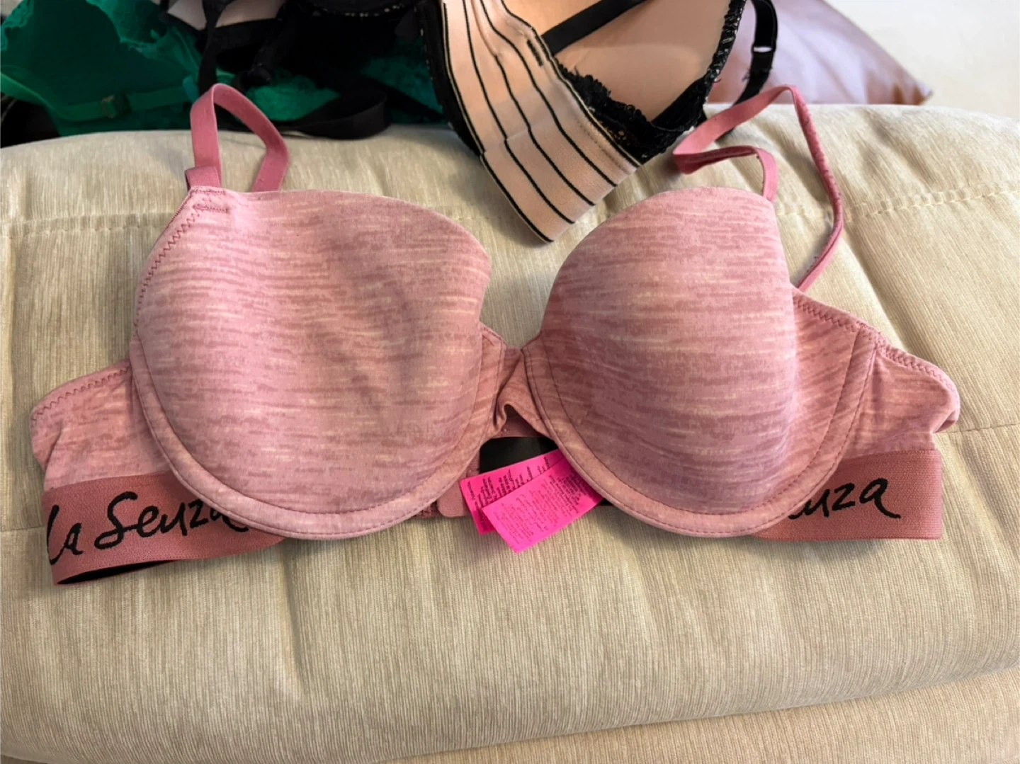 This is a padded bra from La Senza. It's a light pink heathered fabric with a comfortable band. The bra features adjustable straps and a standard hook-and-eye closure. It's designed for everyday wear.