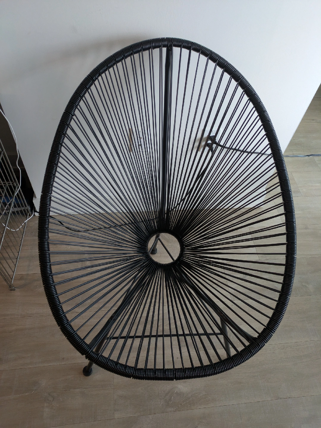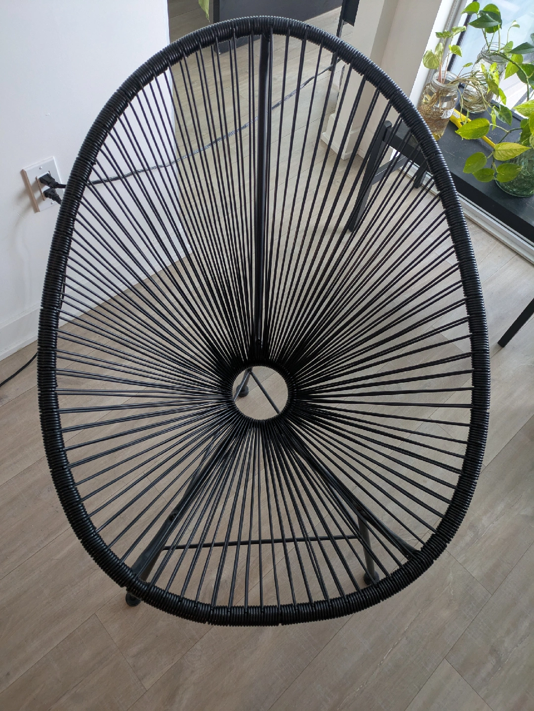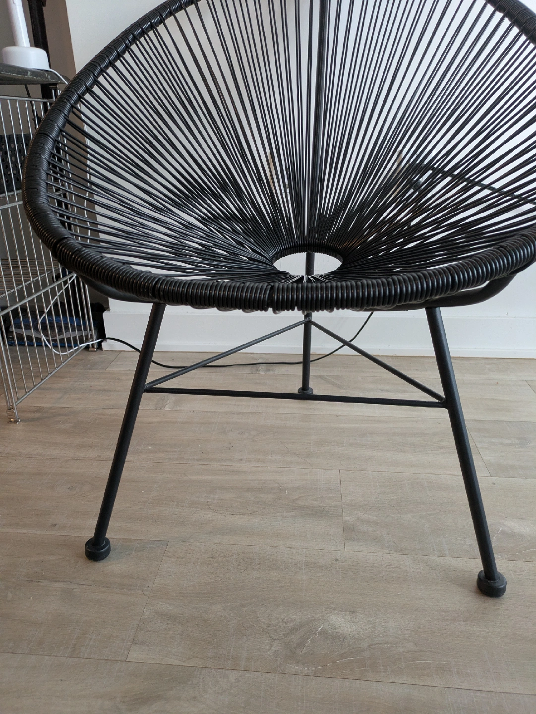 58Selling a black Acapulco chair! This chair is in great condition and ready for a new home. It's a stylish and comfortable addition to any space, whether it's indoors or outdoors. Perfect for relaxing on your patio or adding a touch of modern design to your living room