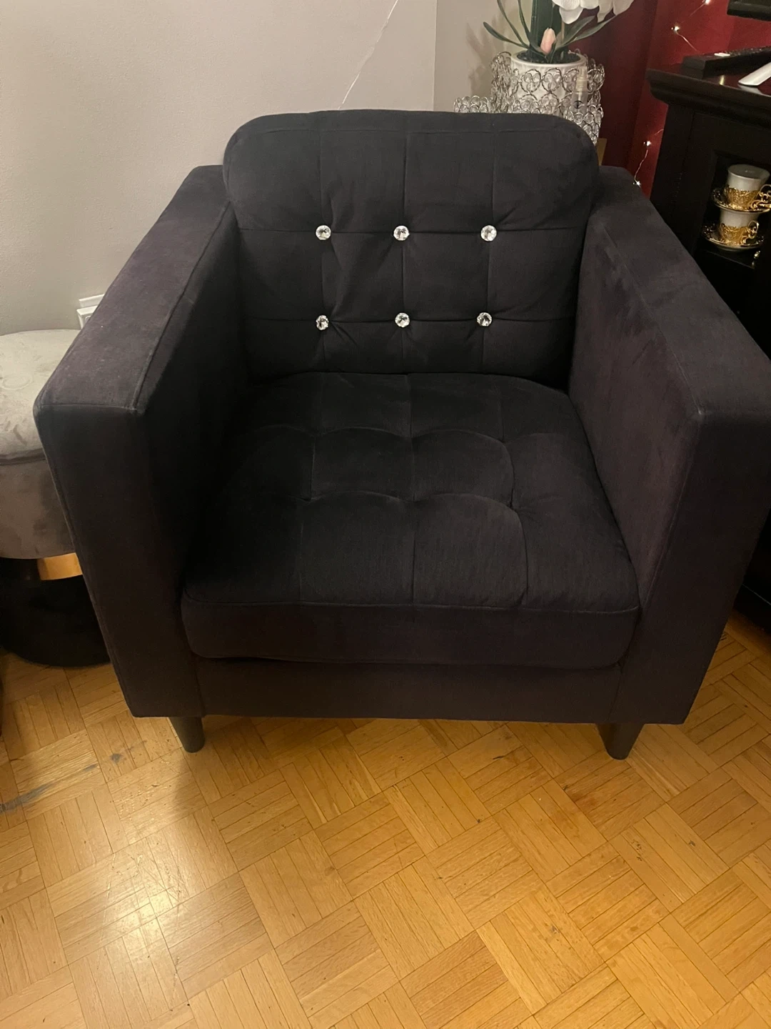 37Selling a stylish black accent chair! It features diamond tufting on the backrest, adding a touch of elegance to any room. The chair is in great condition and would be a lovely addition to your living space or bedroom