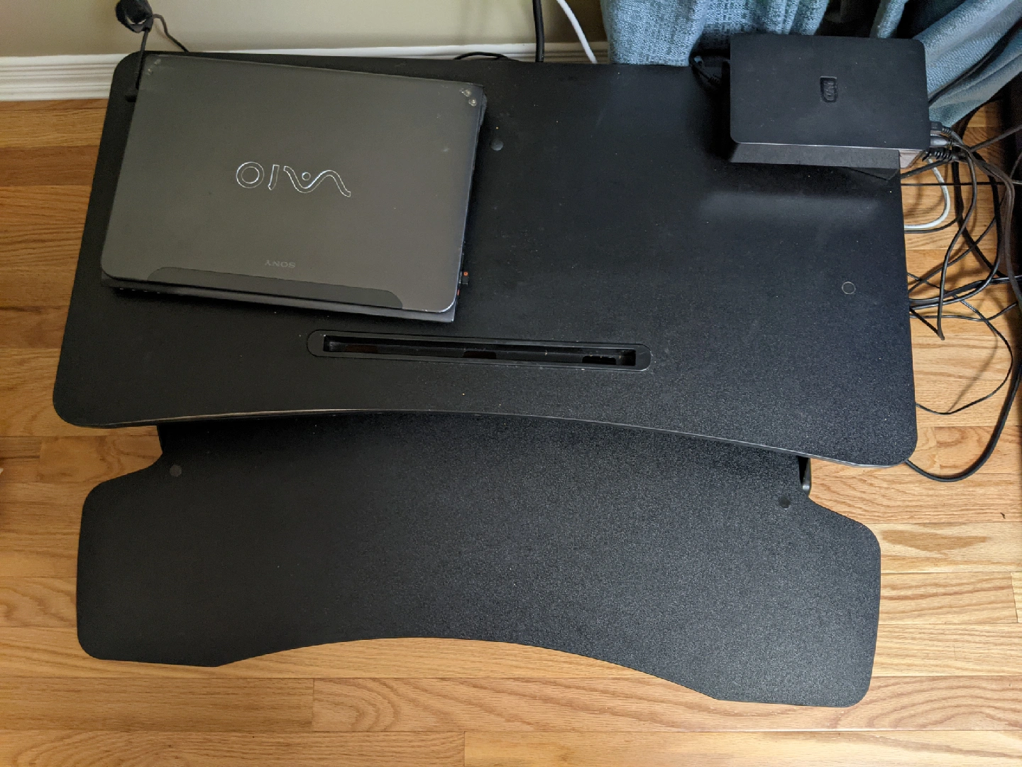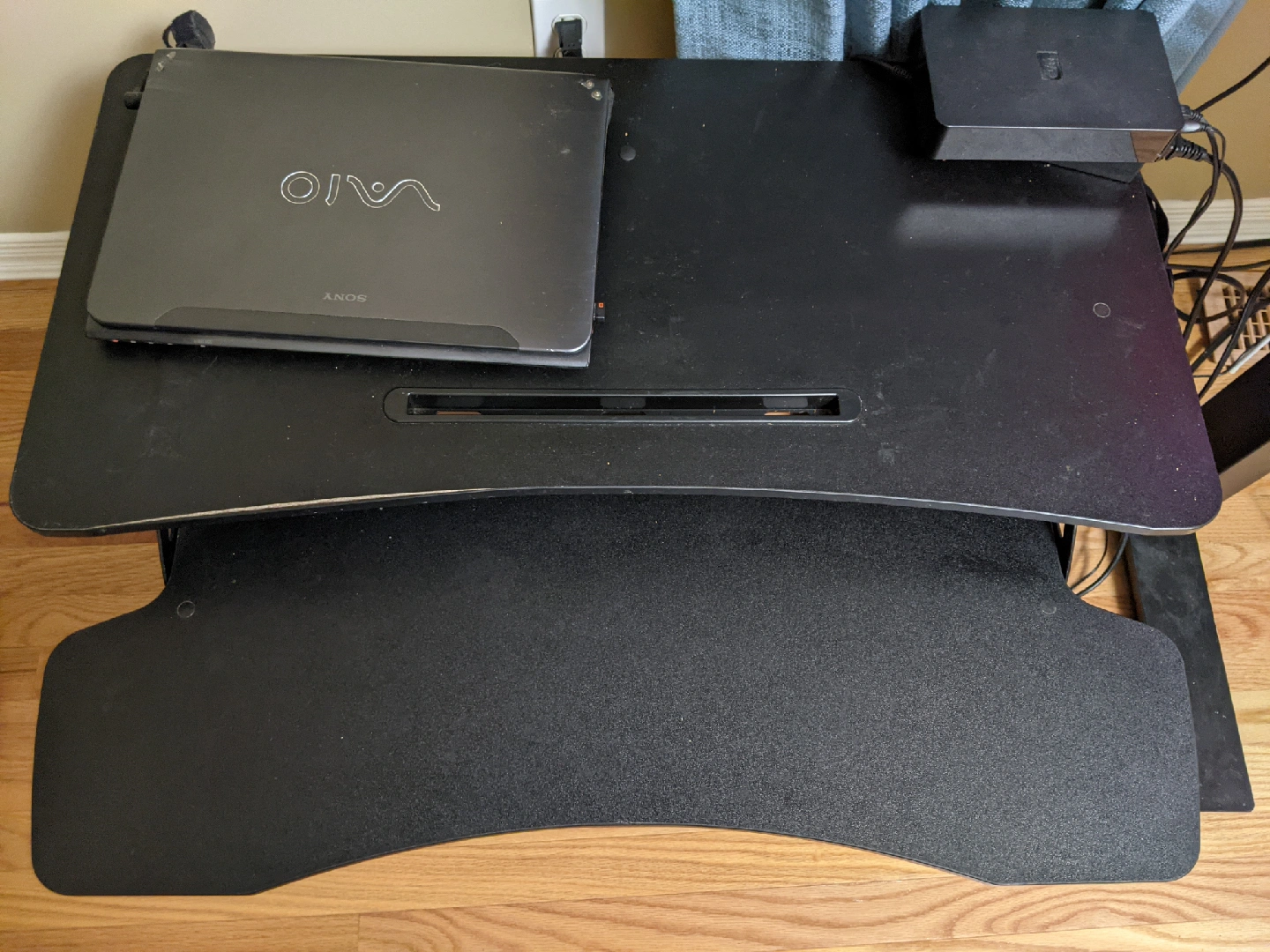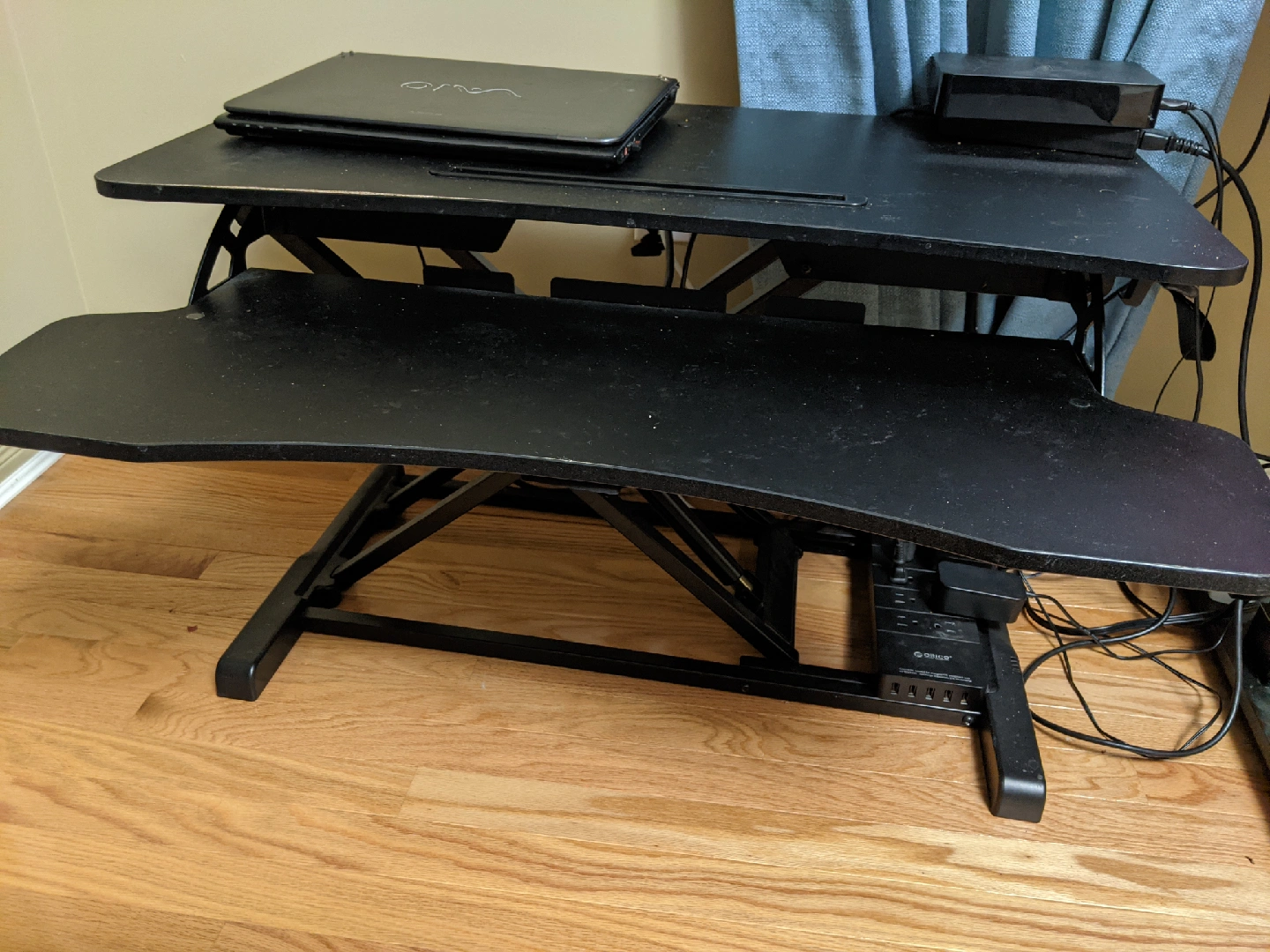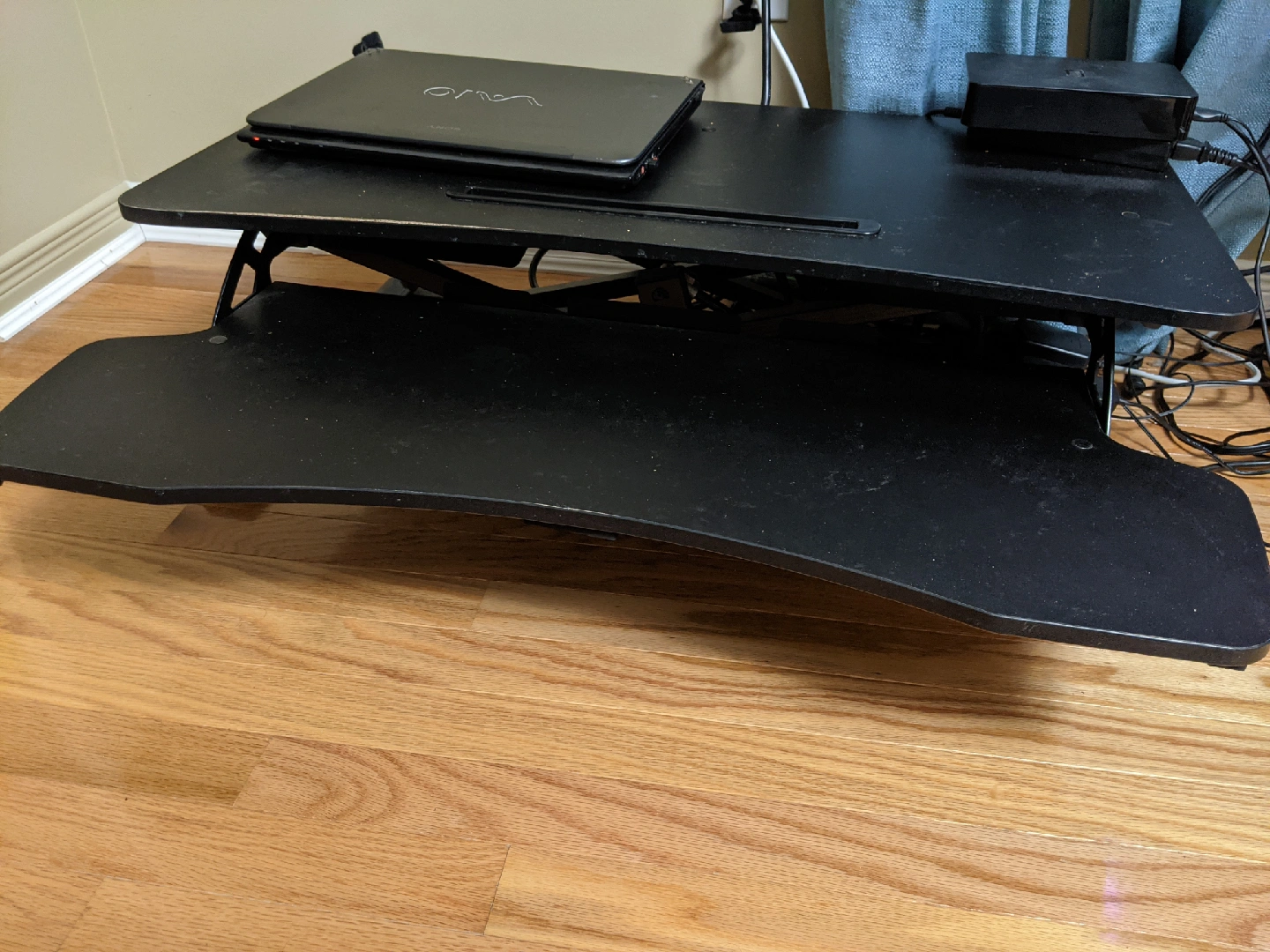 42Selling a black adjustable standing desk. It has a sleek design and is perfect for creating a comfortable and ergonomic workspace. The desk has some signs of use, but is in overall good condition and fully funtional. height is approx around knees, it's not like fully big table. hopefully pictures give you an idea. if you need more info, always ask. thank you