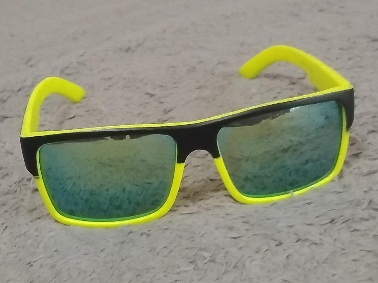 Cool sunglasses with a black frame and neon yellow accents! The lenses have a reflective, iridescent look. Perfect for adding a pop of colour to your outfit