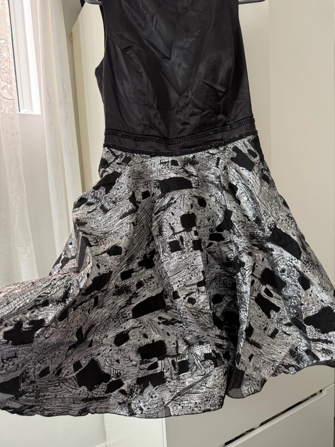 20Elegant sleeveless dress. Black bodice, silver and black patterned skirt. Great for special occasions. Features a fitted bodice and a flared skirt.