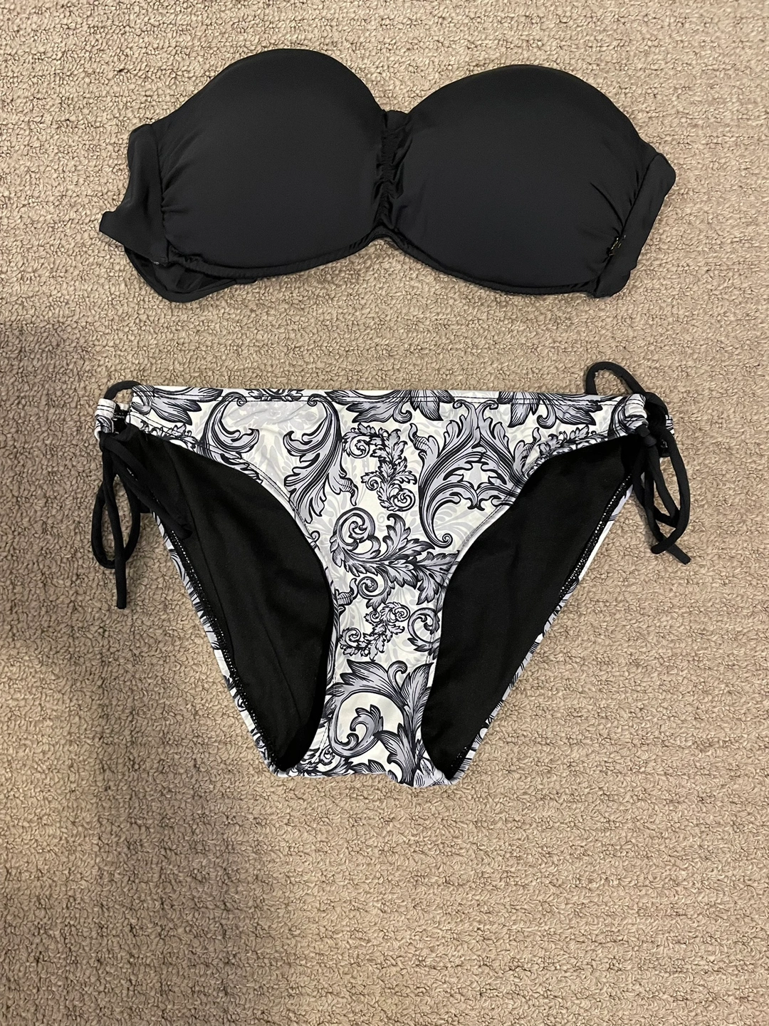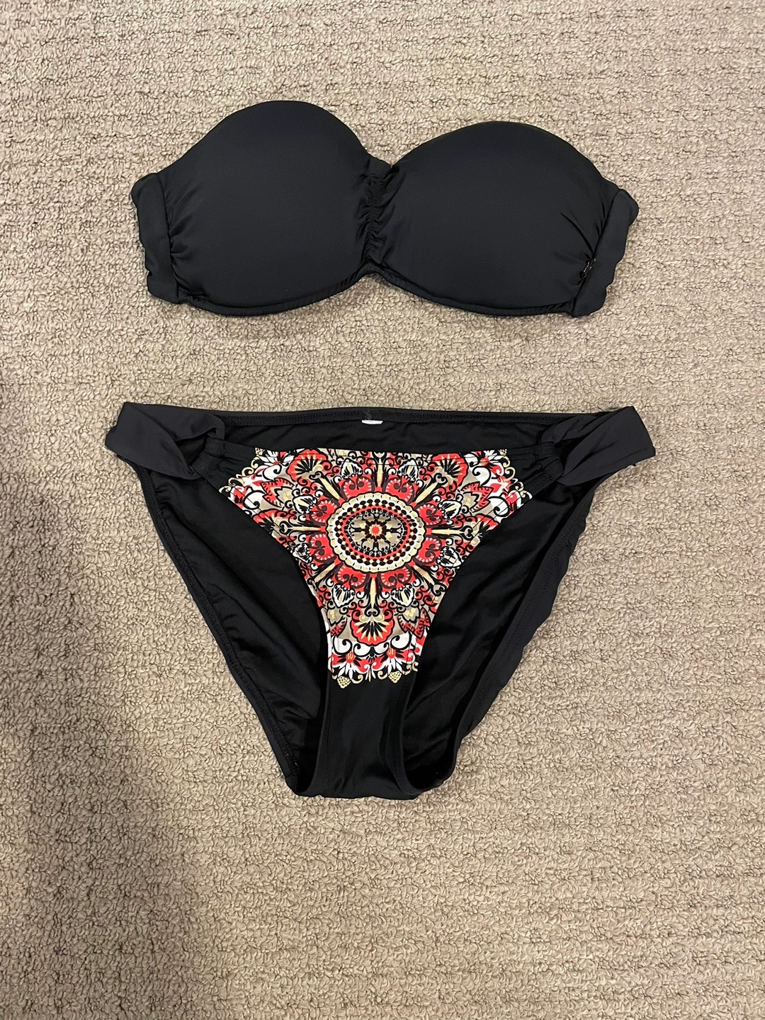 34Black strapless bikini top with a black bottom that has a white and black floral print. The bottom has two ties on each side. Also a second bottom with orange print.