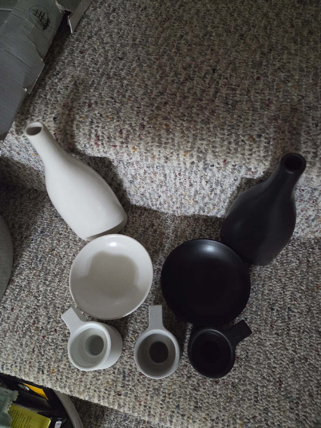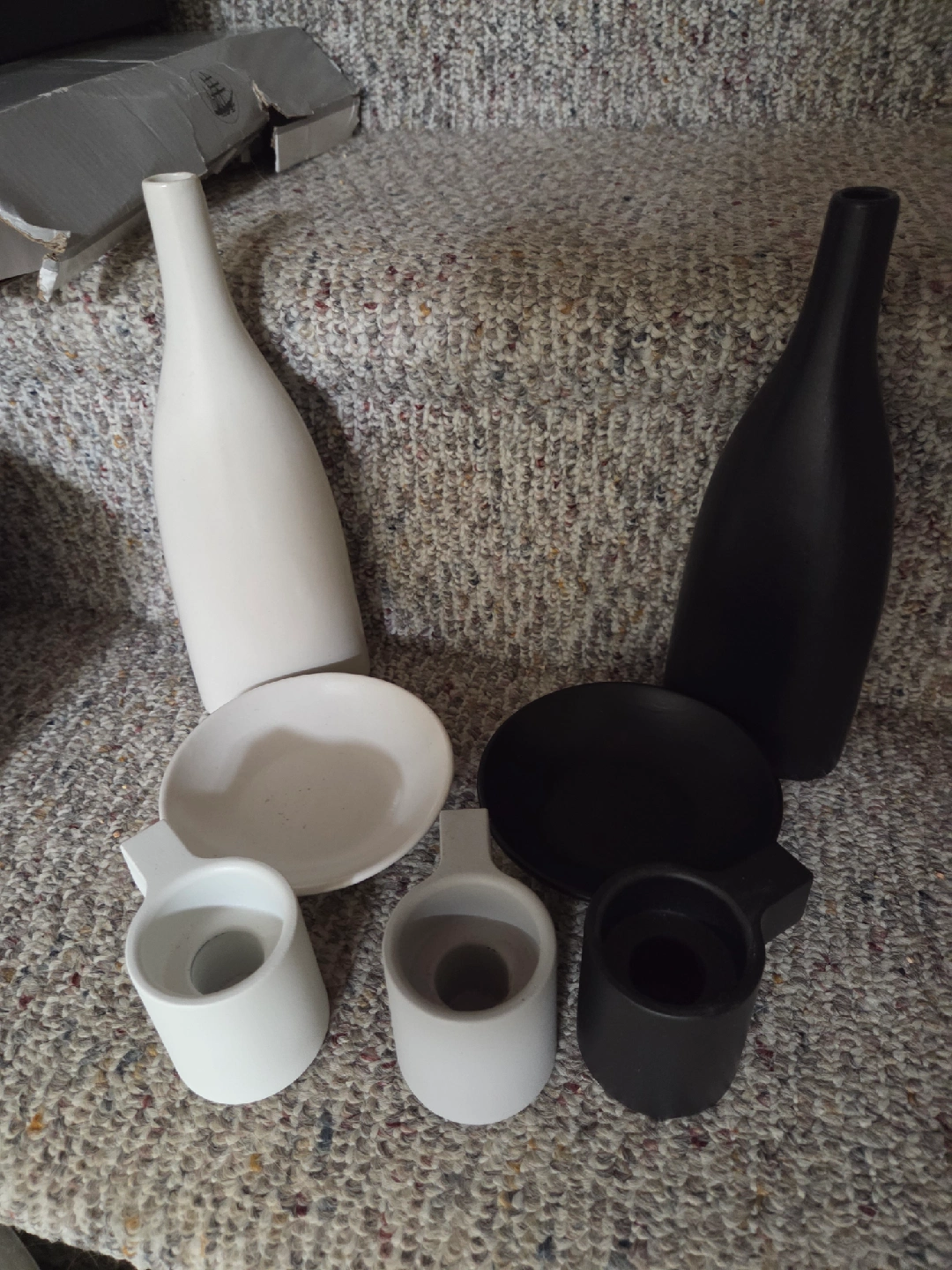 83Selling a set of black and white ceramic vases and dishes. Perfect for adding a modern touch to your home decor! Includes two vases, two small dishes, and two candle holders
