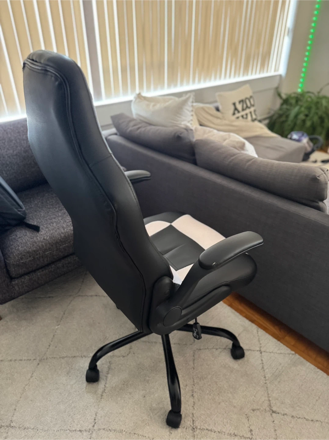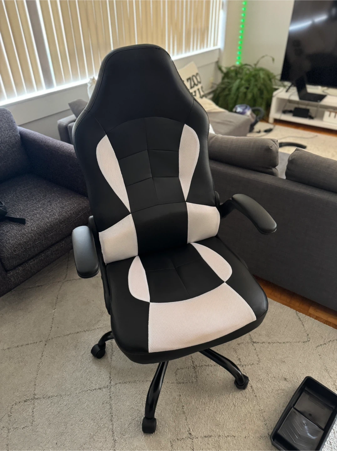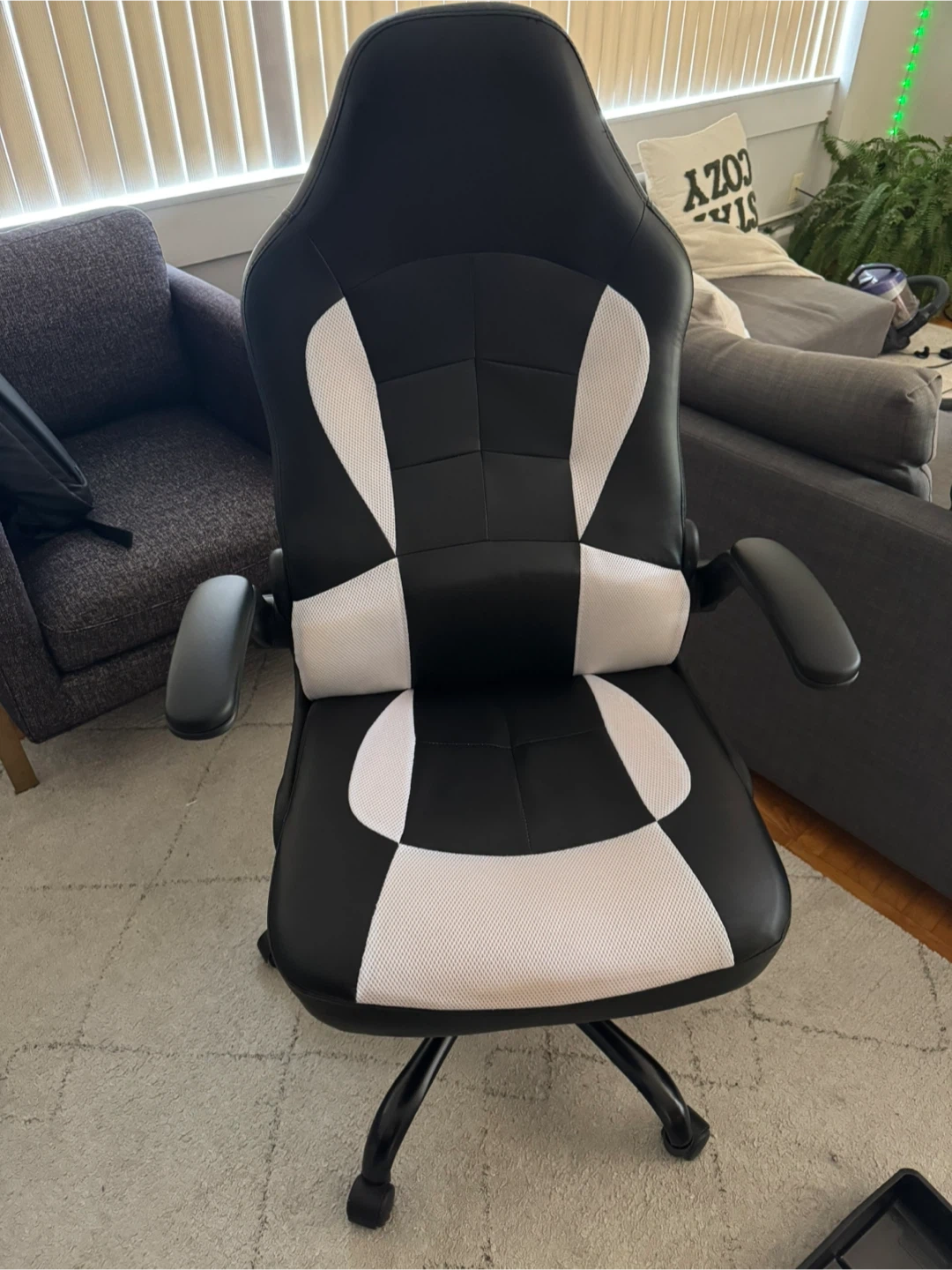 Selling a black and white gaming chair in great condition. It has a high back and lumbar support, perfect for long gaming sessions or working from home. The chair is comfortable and supportive. It's ready for a new home!