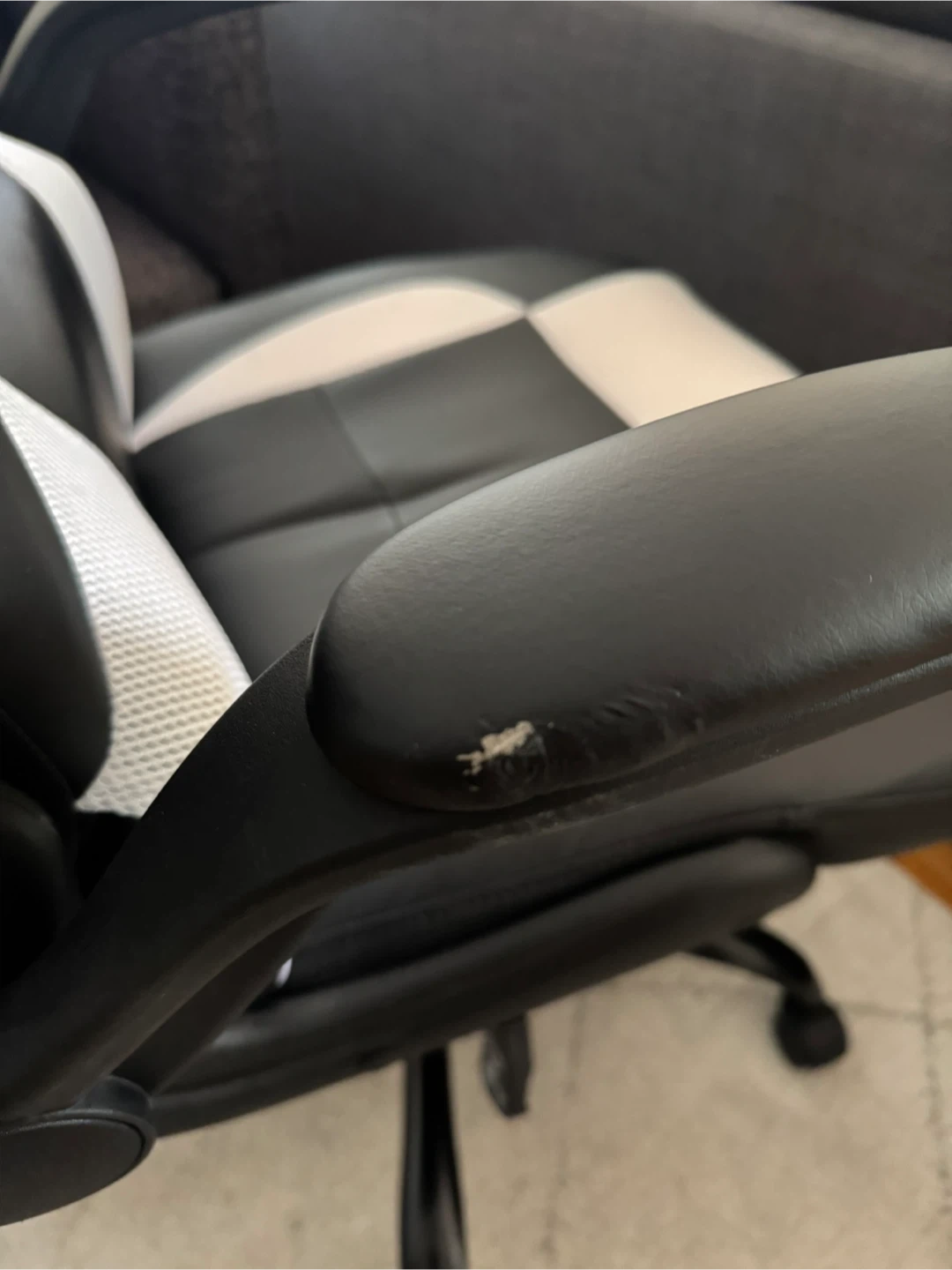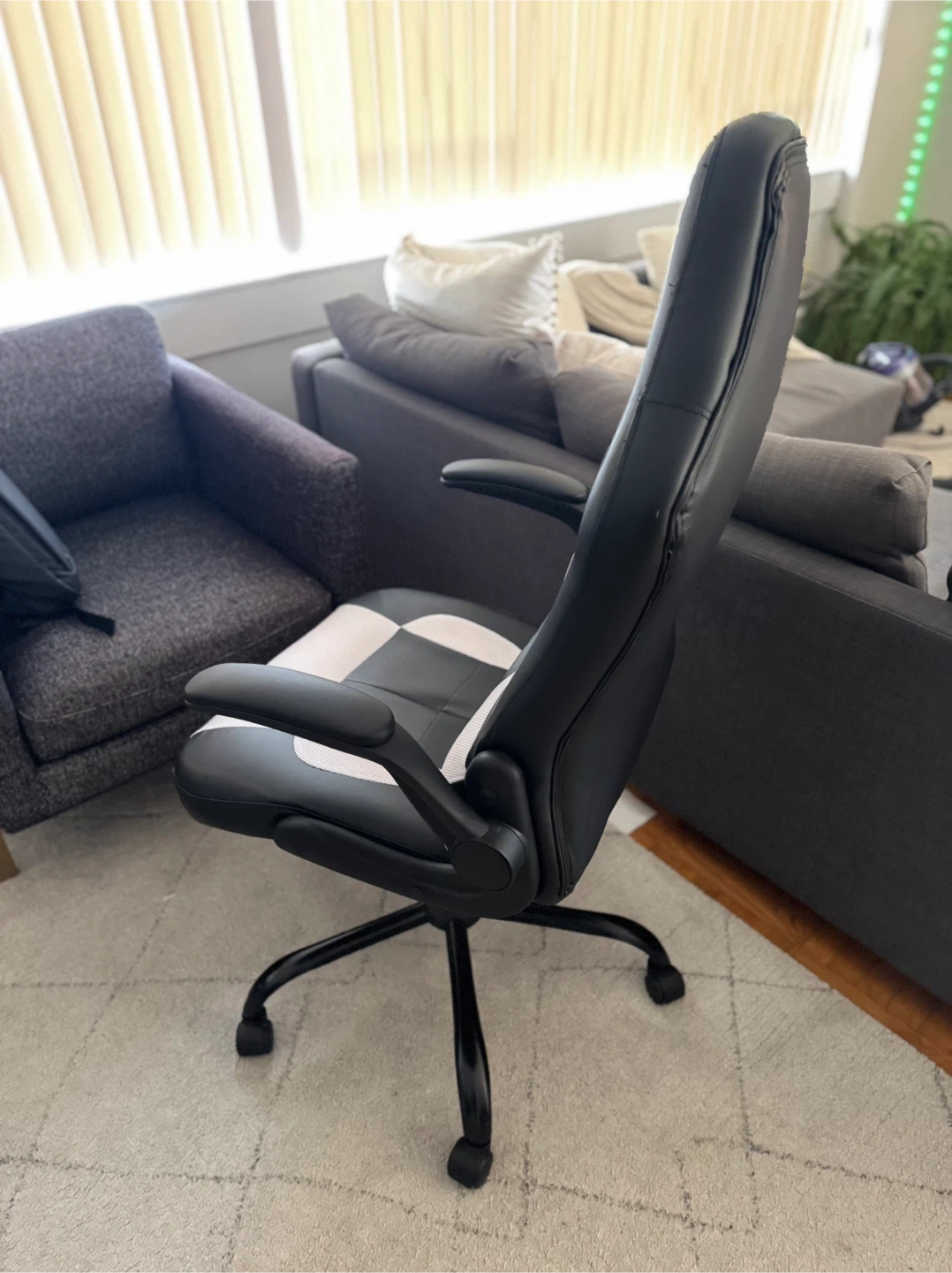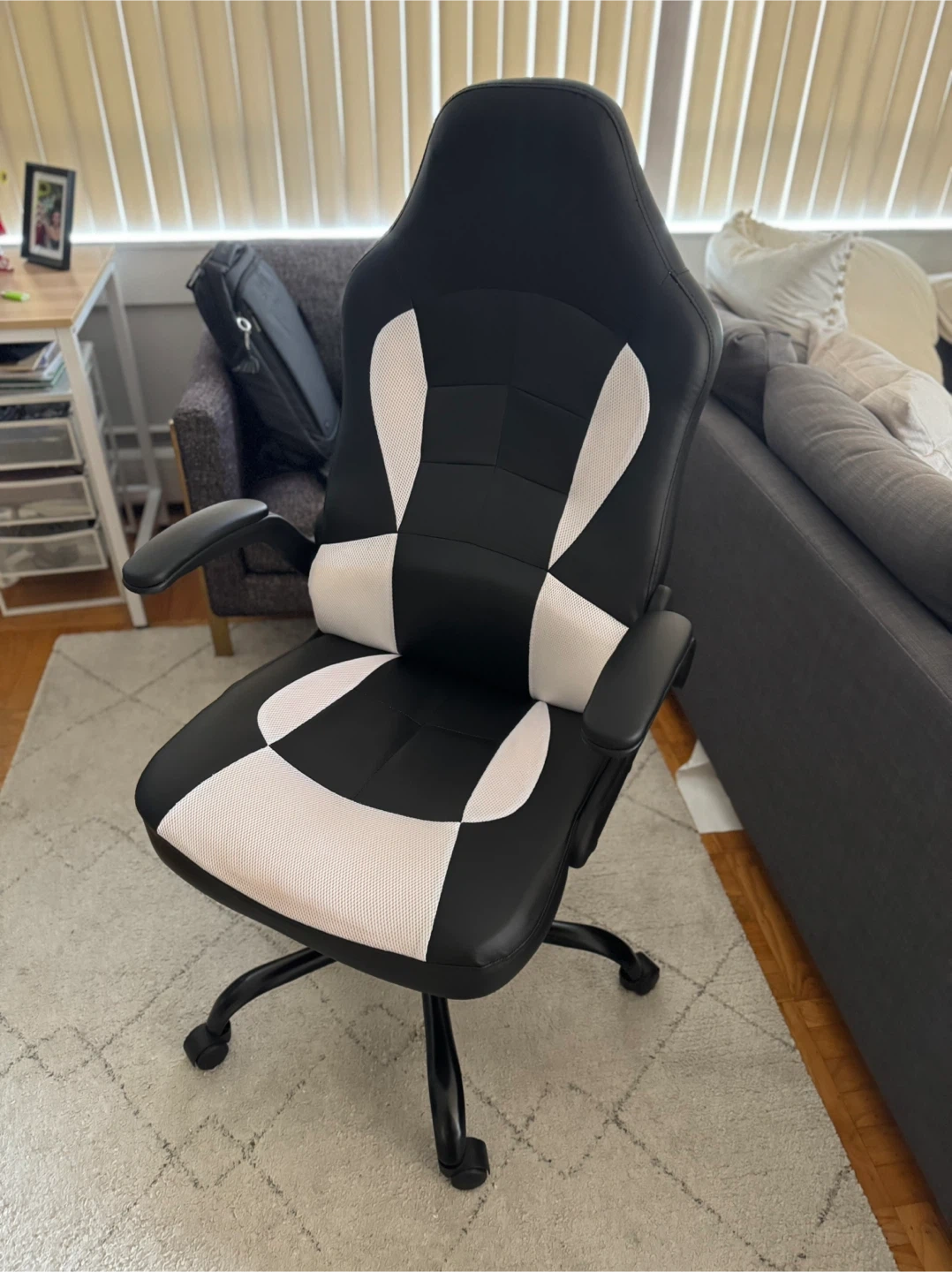 Selling a black and white gaming chair in great condition. It has a high back and lumbar support, perfect for long gaming sessions or working from home. The chair is comfortable and supportive. It's ready for a new home!
