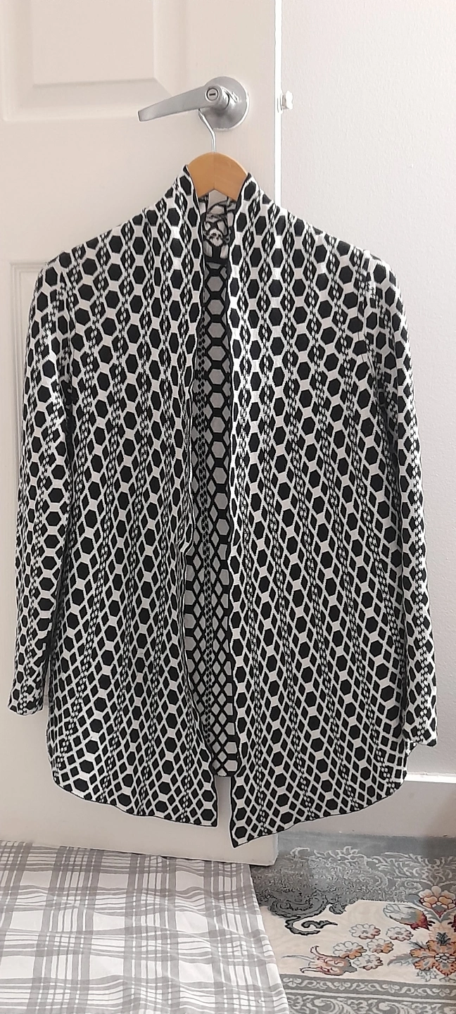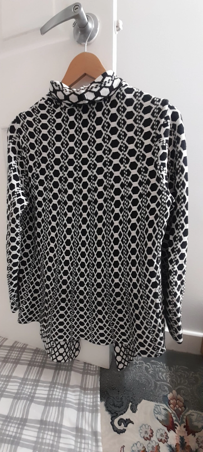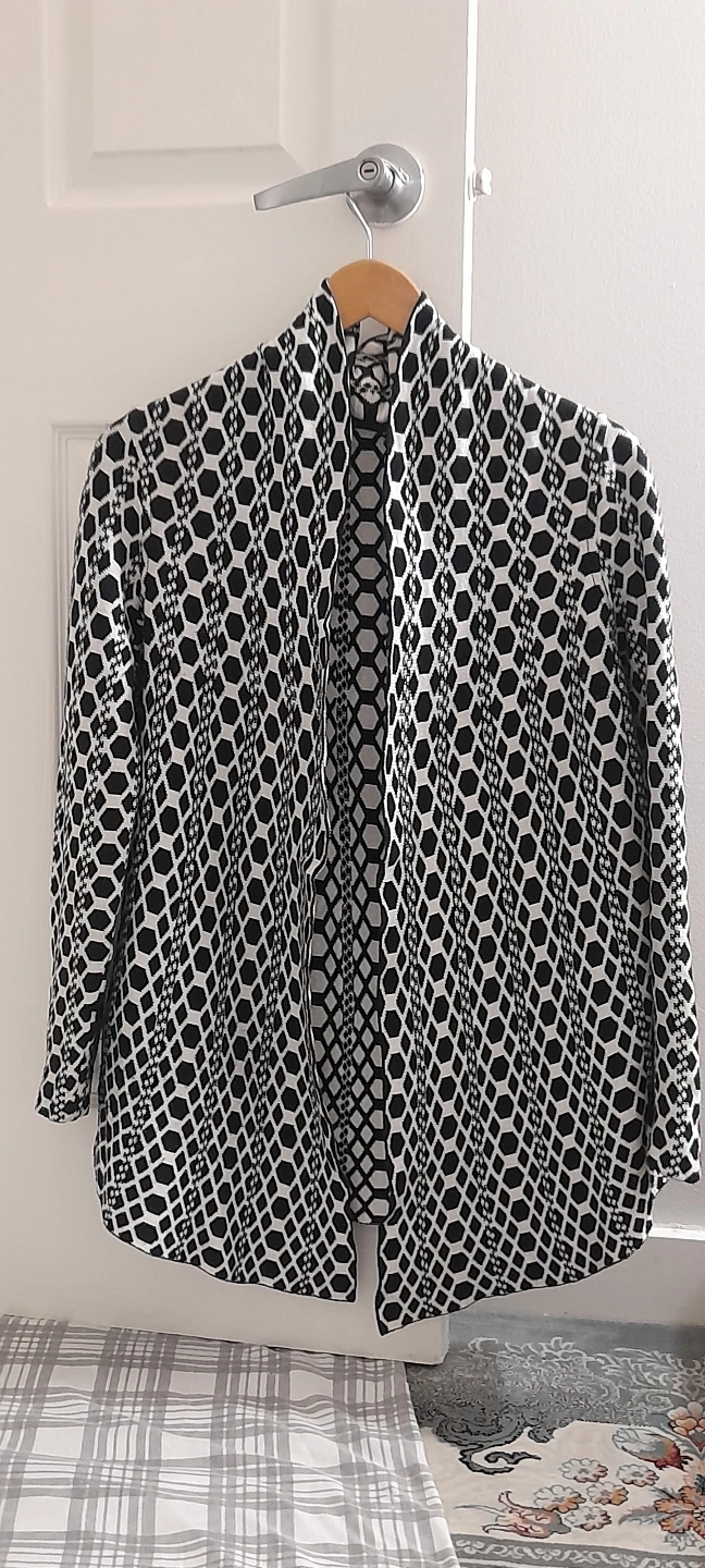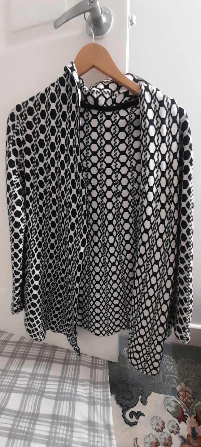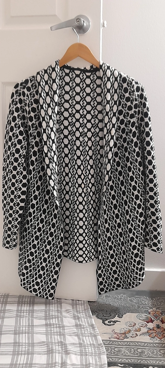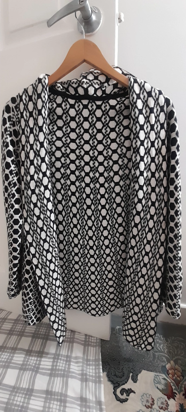 Women's open front cardigan. Black and white geometric pattern. Three-quarter sleeves. Relaxed fit.
