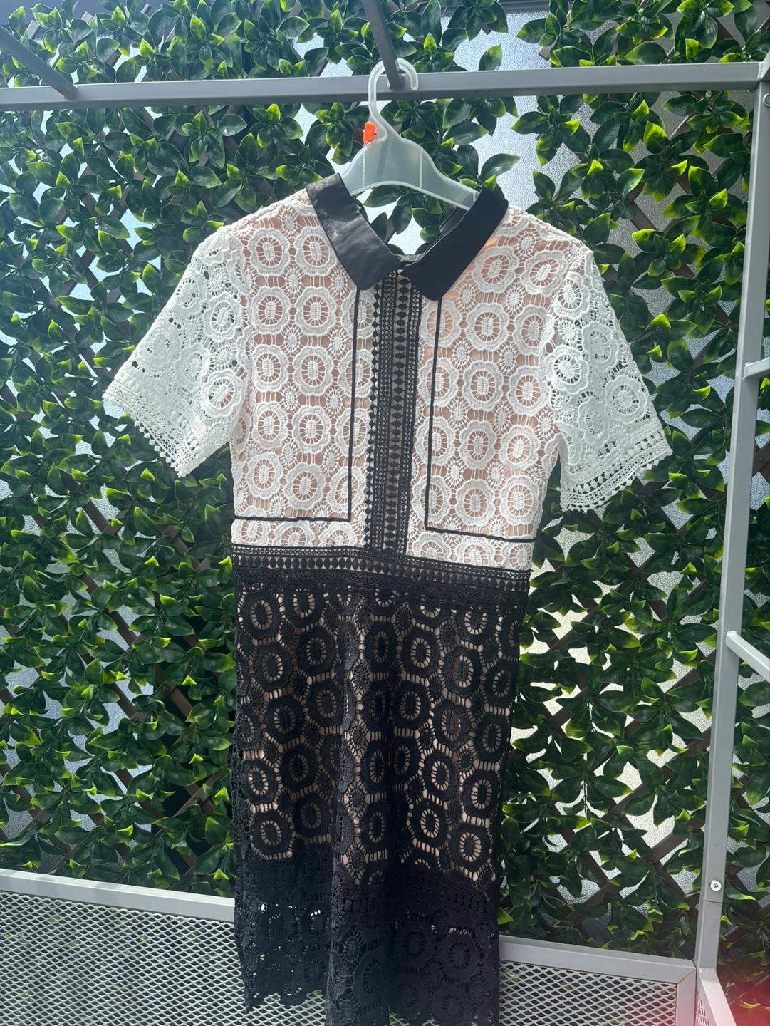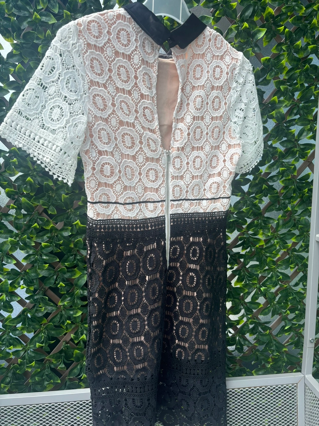 Self portrait inspired black and white lace dress. Features short sleeves, a collared neckline, and a fitted silhouette. Back zipper closure. Beautiful detail throughout.