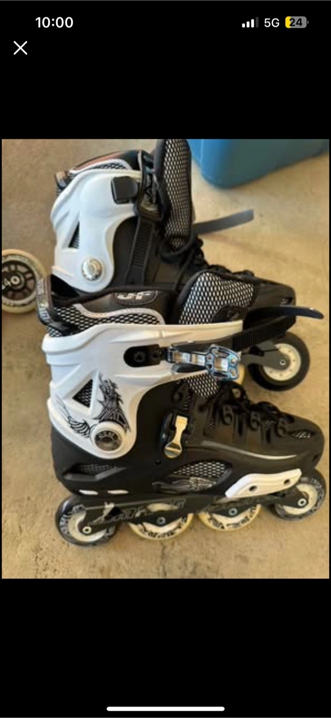 Inline skates in black and white. Feature wheels and a boot design. A great way to enjoy some fresh air and sunshine. Rollerblades are perfect condition bought but only used once