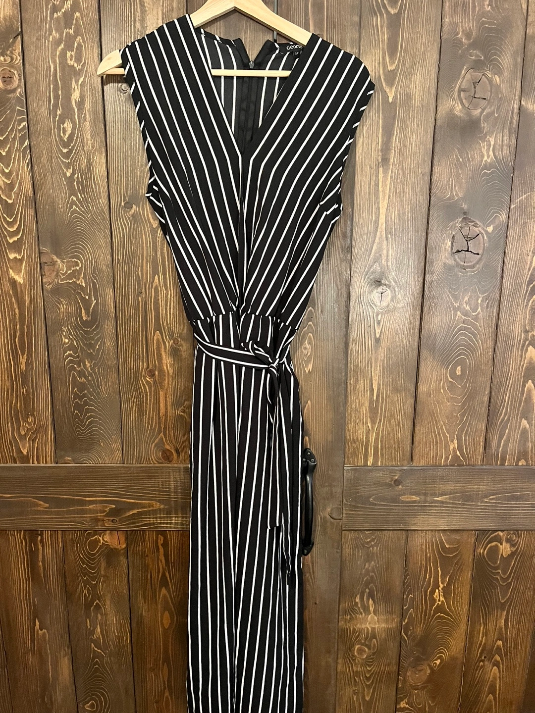 Sleeveless jumpsuit. Black and white diagonal stripes. V-neck. Self-tie belt. Perfect for a summer event.