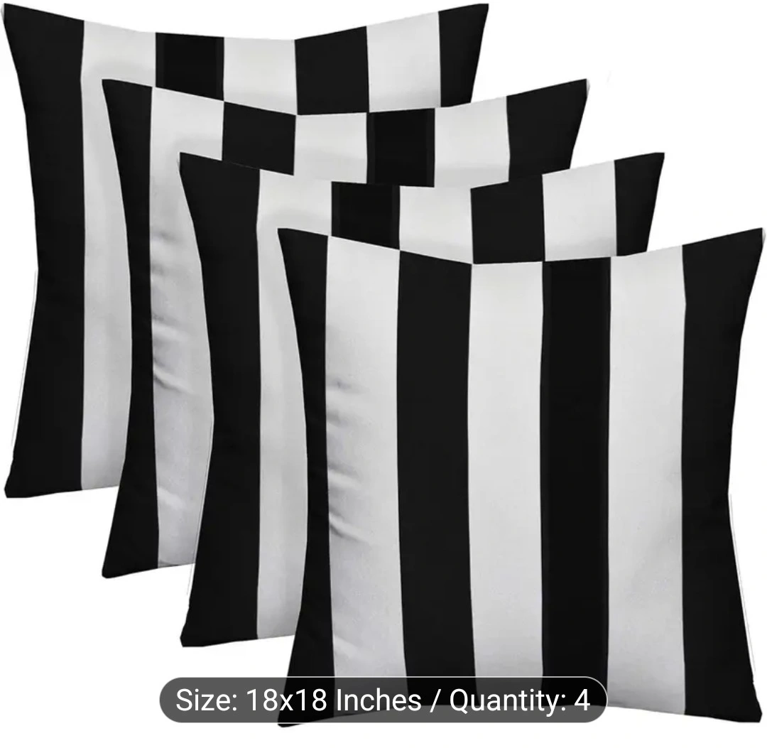 Here's a set of four pillow covers in a striking black and white striped pattern! They're sized at 18x18 inches, perfect for adding a touch of modern flair to your living space. These are in great condition and ready to find a new home on your couch or bed
