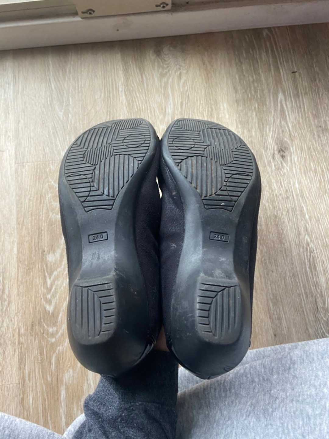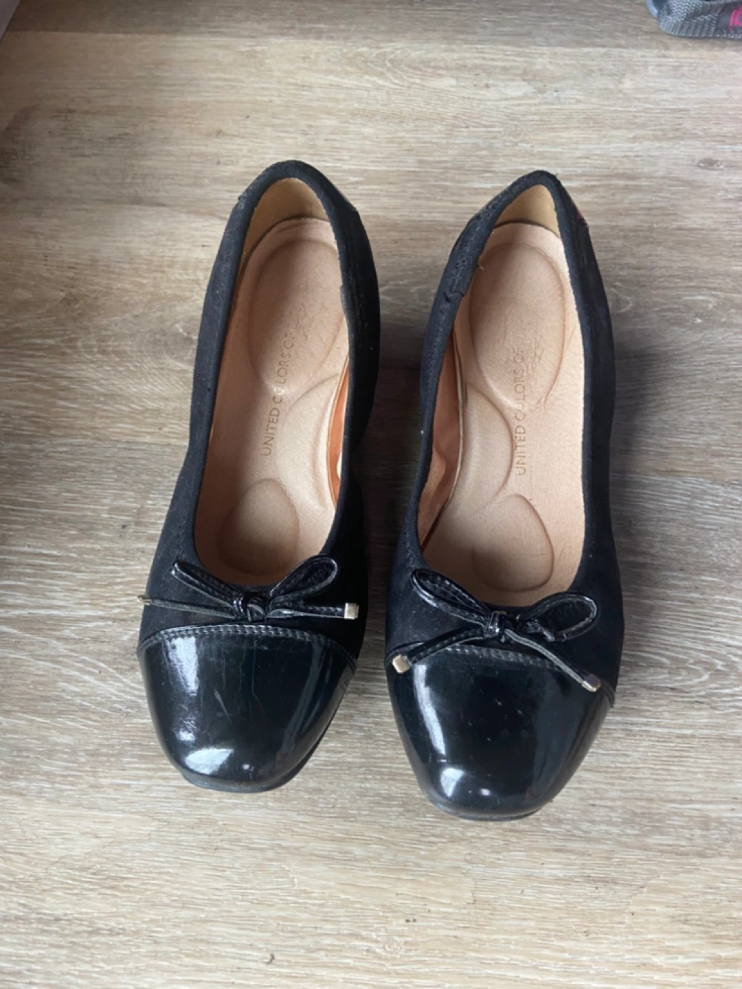 66Pair of black women's ballerina flats. Patent leather toe cap. Small bow detail. Cushioned insole. Size 24cm.