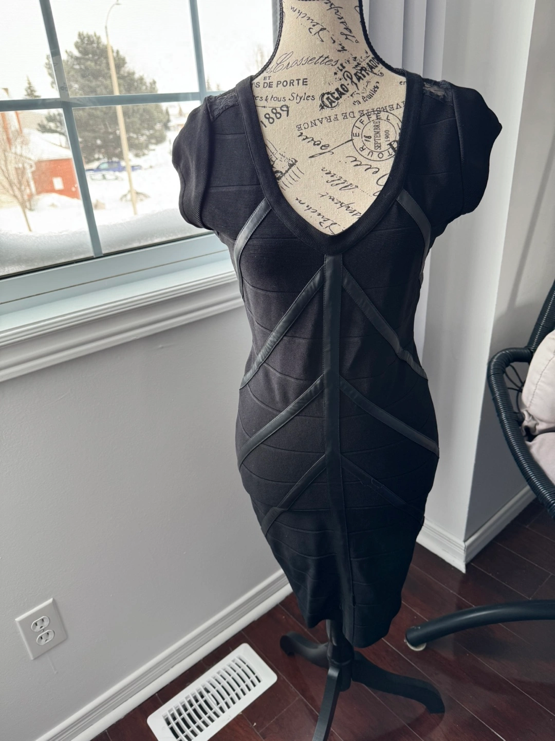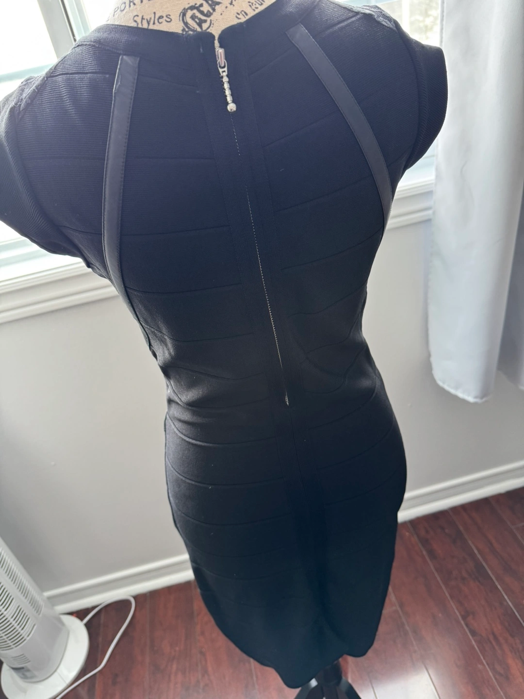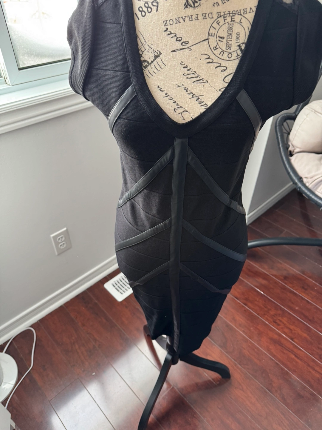 Black bandage dress, short sleeves, V-neck, figure-hugging, zipper closure. Features leather-look accents.