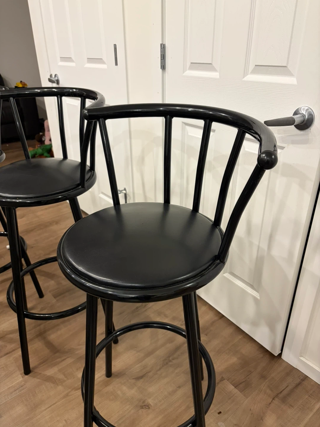 15Selling a set of three bar stools in black. They're in great condition and would look fantastic in any kitchen or bar area. Sturdy and stylish! Also has a swivel feature!