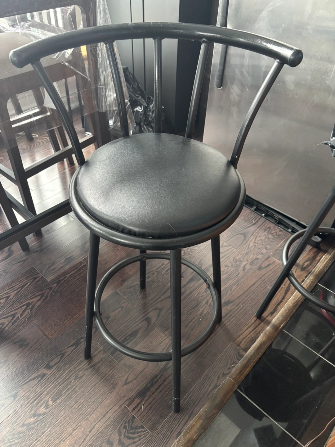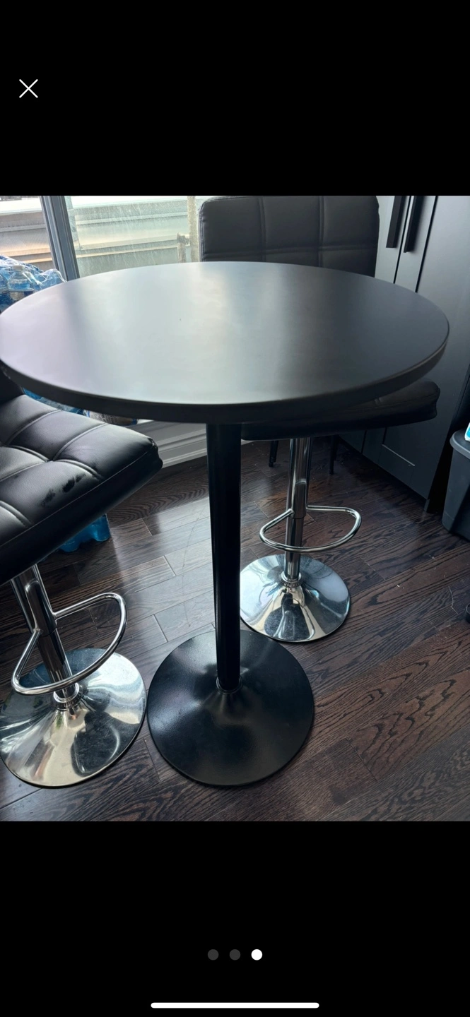 5Black bar table with a round tabletop and chrome base. Two matching bar stools with black faux leather seats and metal frames.