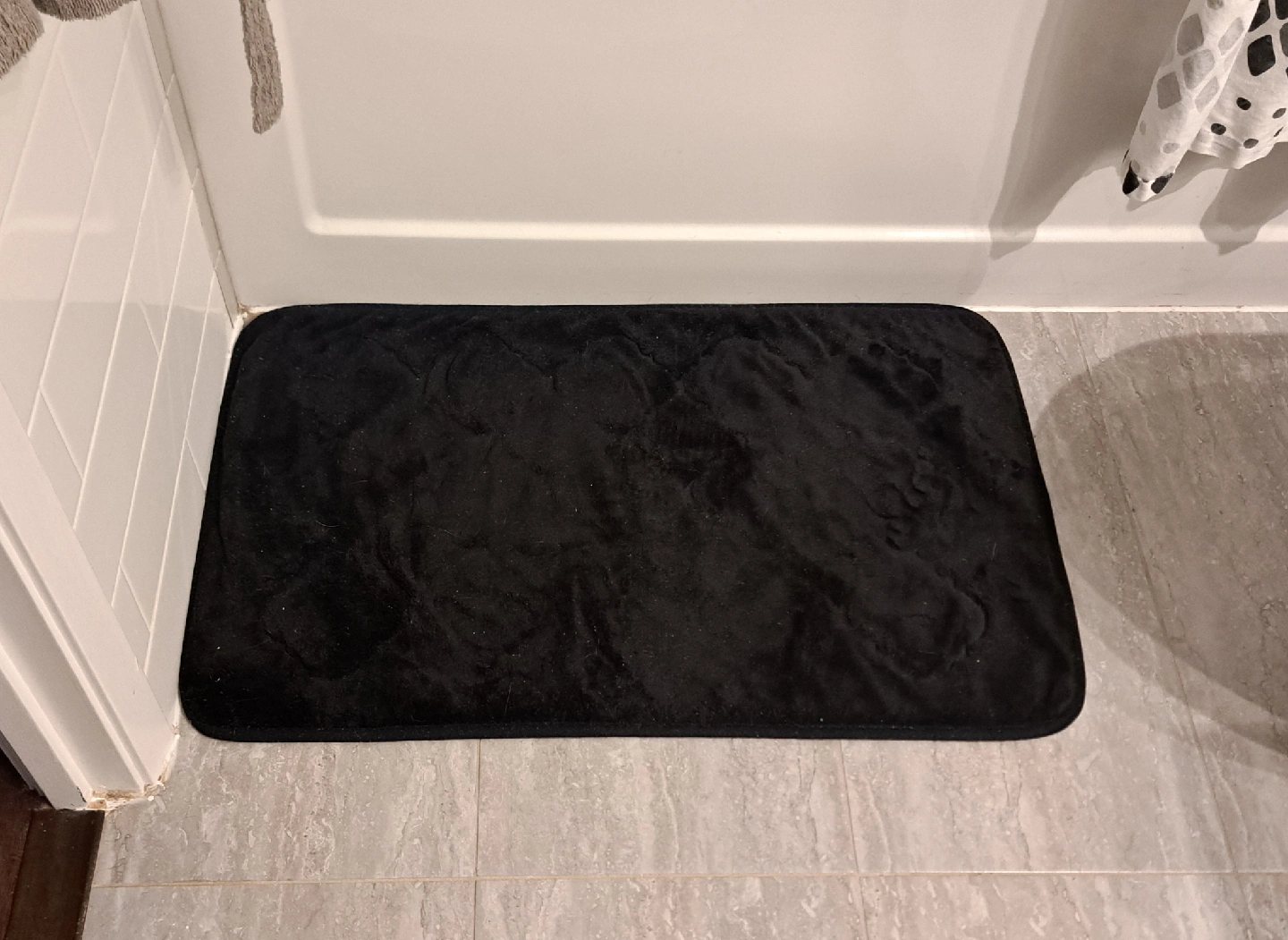 5430.5" x 19" black bath mat. The rubber traction on the bottom is worn away and the mat's cushioning is pretty much gone, but there are no tears or holes. PICK-UP ONLY outside Wellesley Station. From a smoke-free but NOT pet-free home (cat).