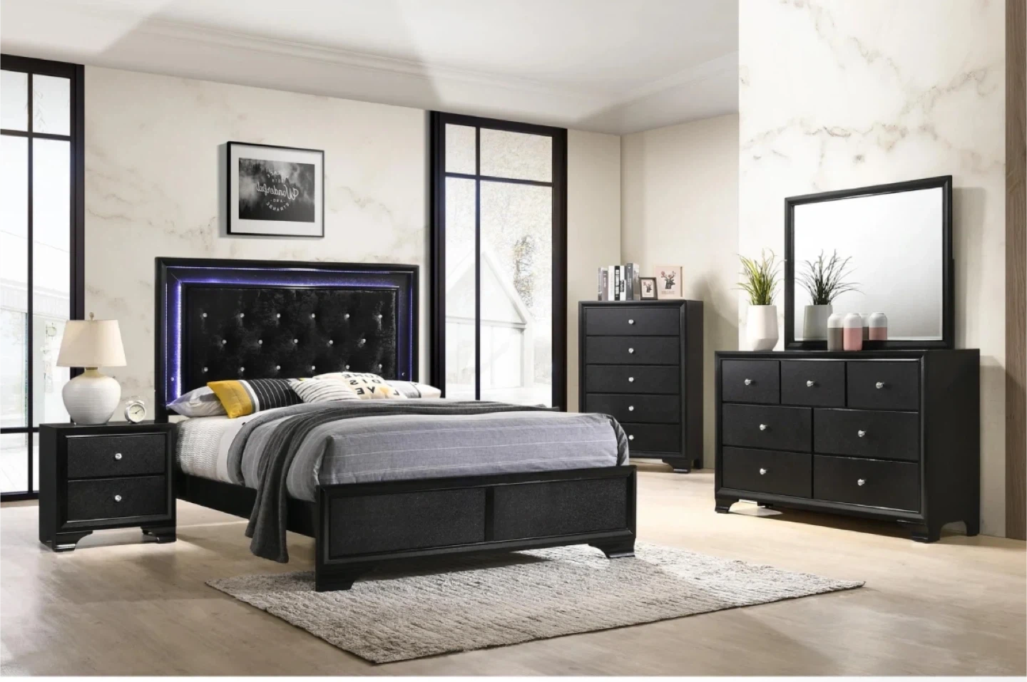 10Selling a complete bedroom set in great condition! Includes a bed frame with a tufted headboard and LED lighting, a dresser with a mirror, a chest of drawers, and a nightstand. All pieces are in a sleek black finish and would look great in any bedroom!