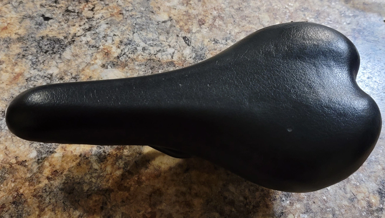 Used bicycle saddle. Black vinyl. Standard mounting hardware. Can fit on any bicycle