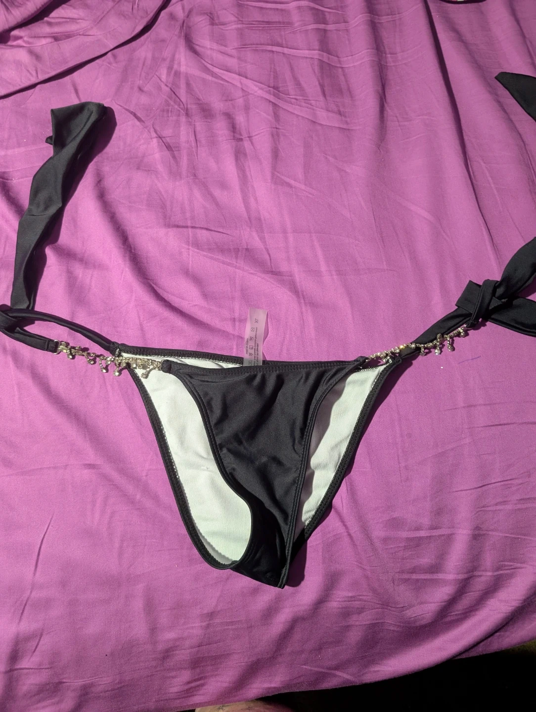 65Selling a black bikini bottom with cute rhinestone detailing! It's in great condition and ready for the beach or pool