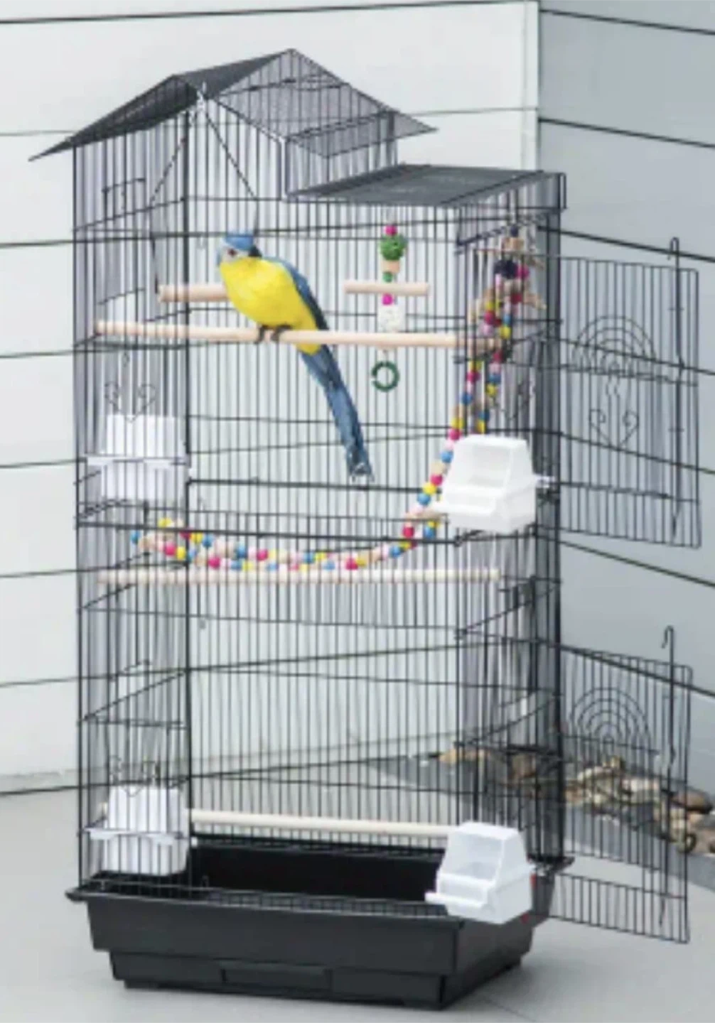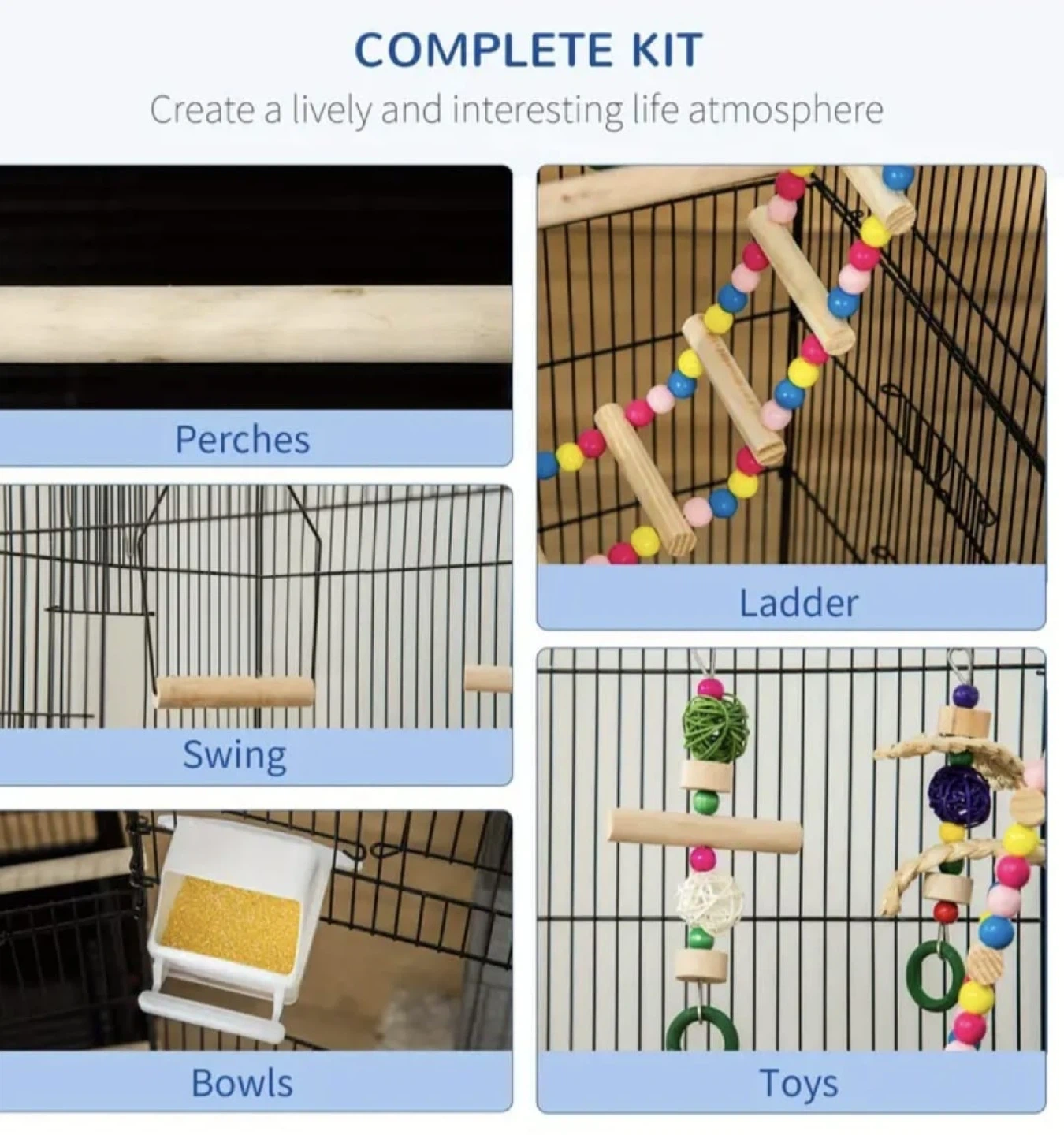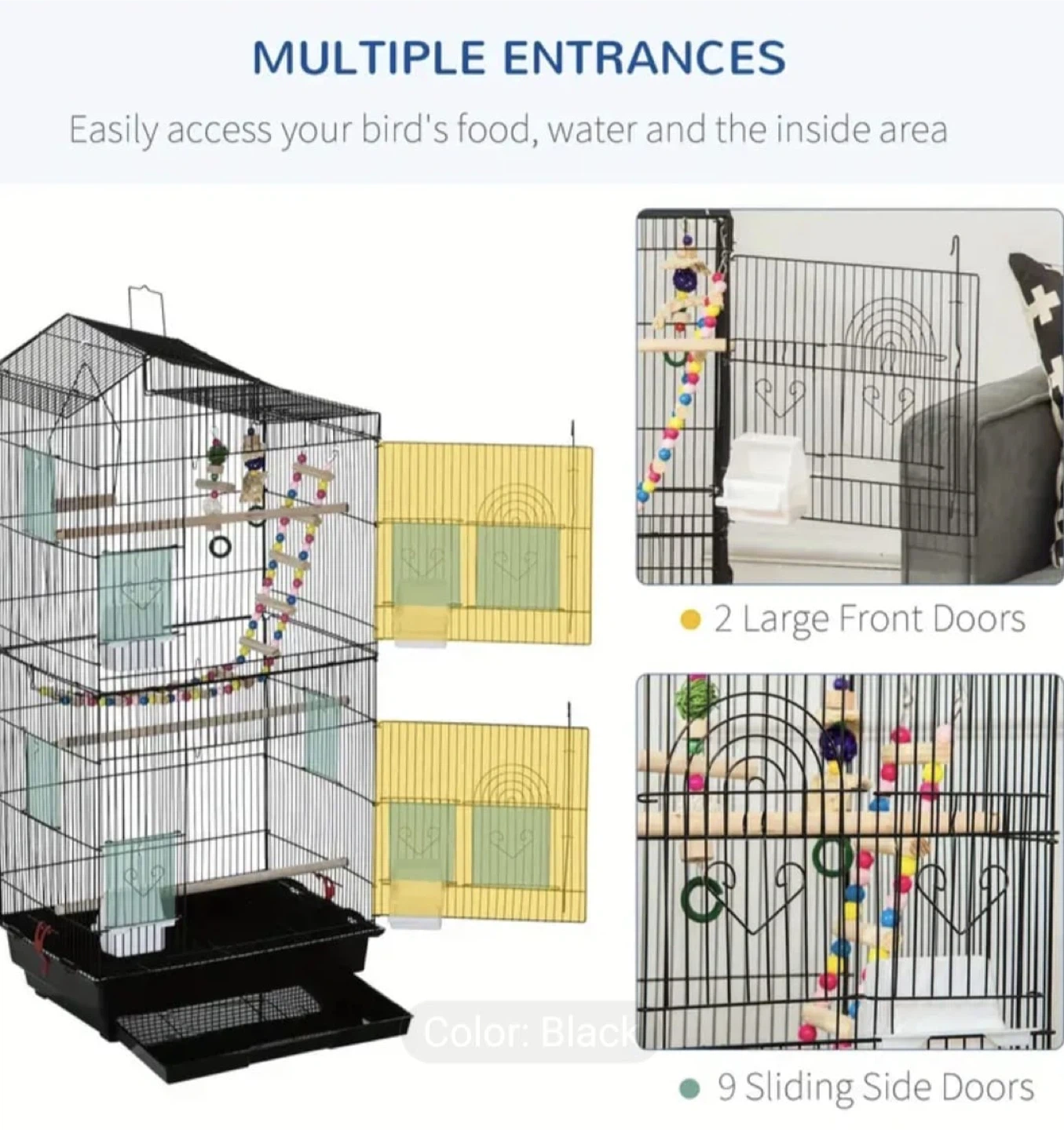 10Selling a bird cage that comes with a complete kit to create a lively and interesting atmosphere for your feathered friend! The cage is black and includes perches, a ladder, a swing, bowls, and toys. It also features multiple entrances with 2 large front doors and 9 sliding side doors. Plus, it has a slide-out tray to easily catch bird seeds and droppings