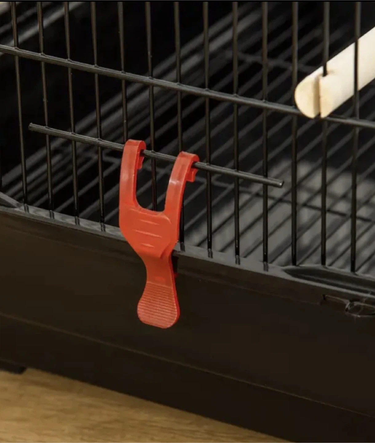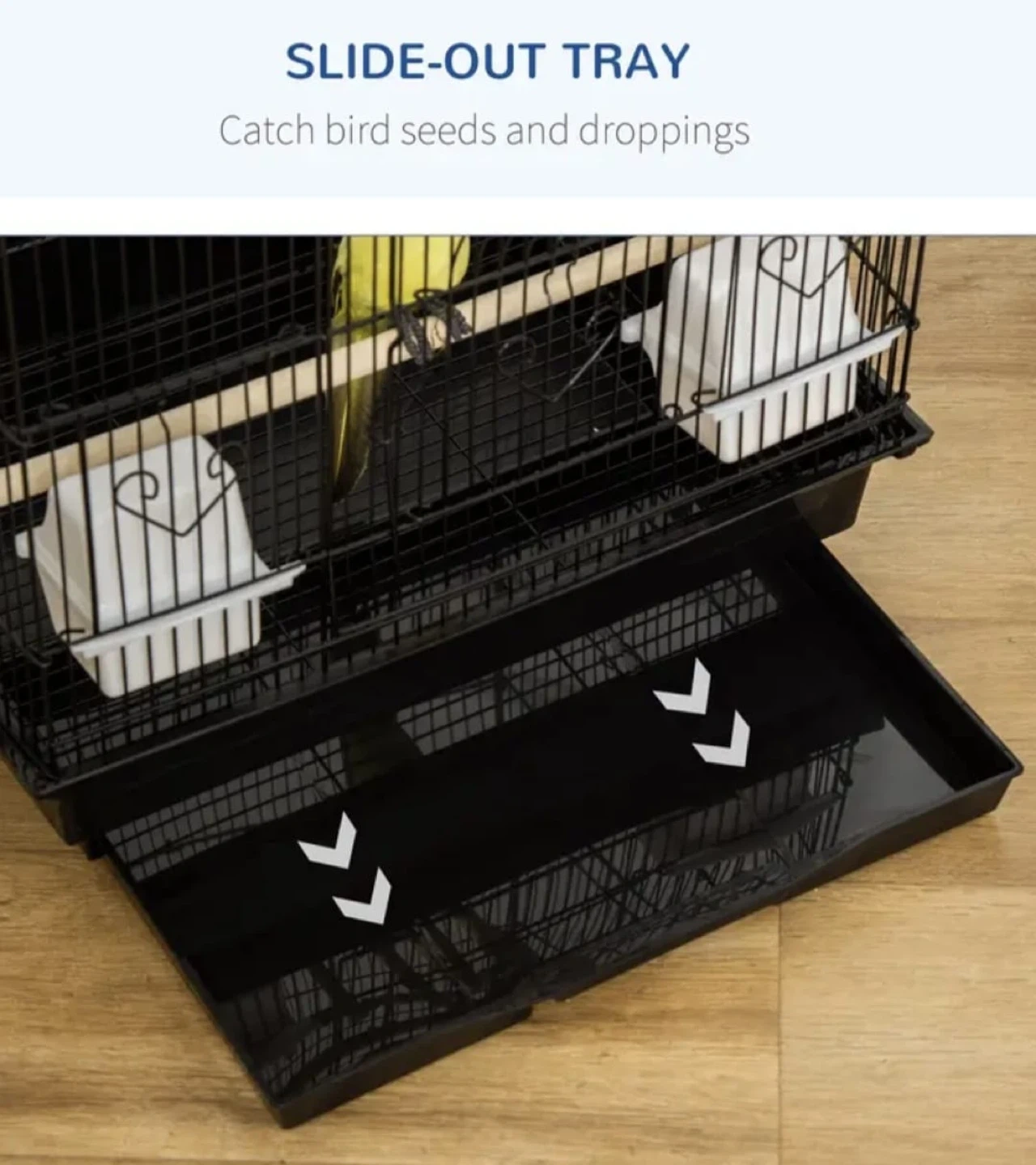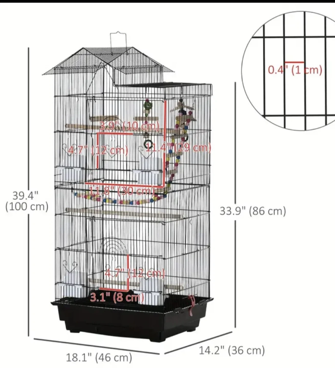 10Selling a bird cage that comes with a complete kit to create a lively and interesting atmosphere for your feathered friend! The cage is black and includes perches, a ladder, a swing, bowls, and toys. It also features multiple entrances with 2 large front doors and 9 sliding side doors. Plus, it has a slide-out tray to easily catch bird seeds and droppings