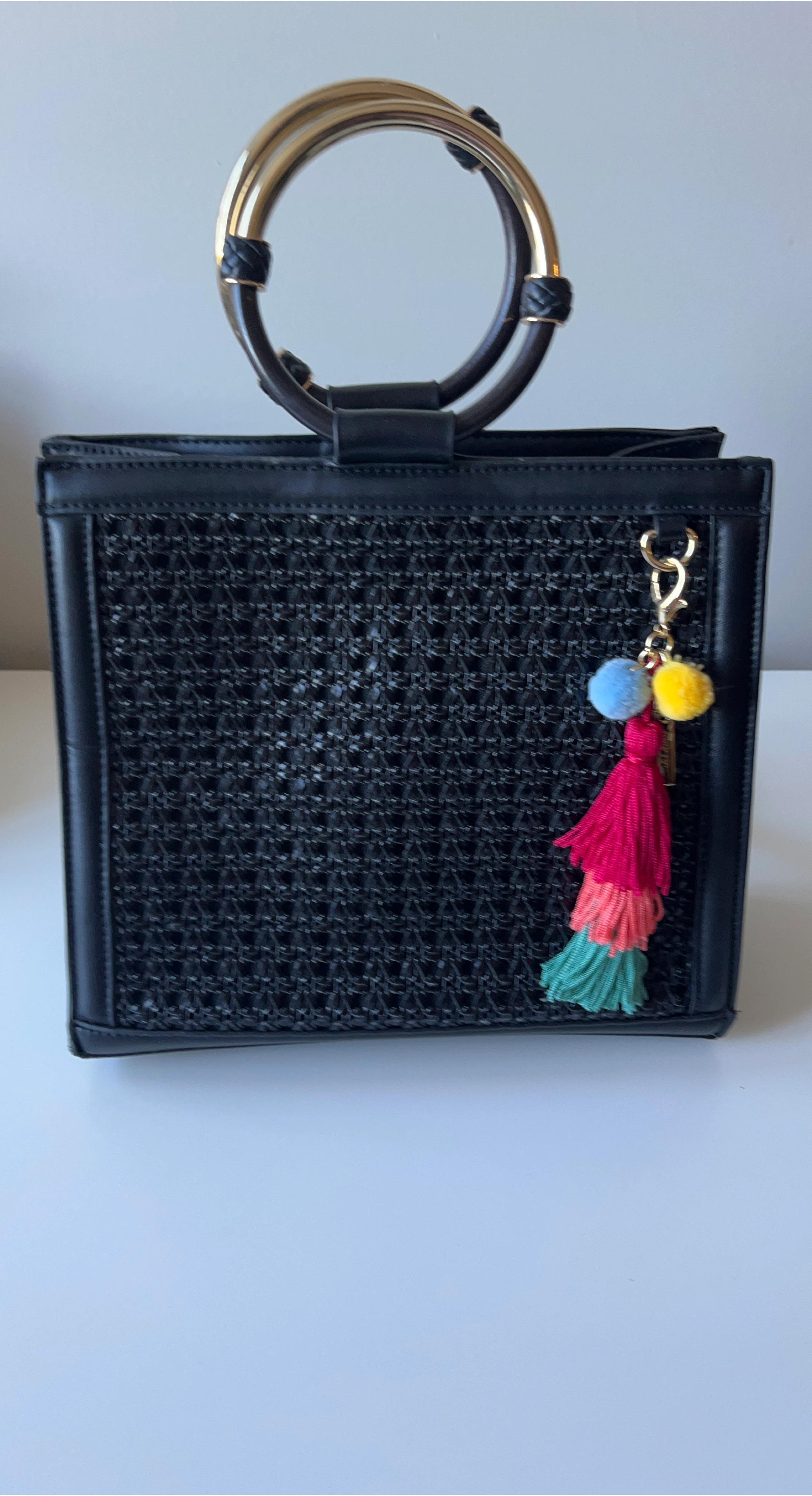 5Cute black box bag with a unique round handle and a fun tassel detail! The bag has a woven texture on the front and back. Perfect for adding a stylish touch to any outfit!