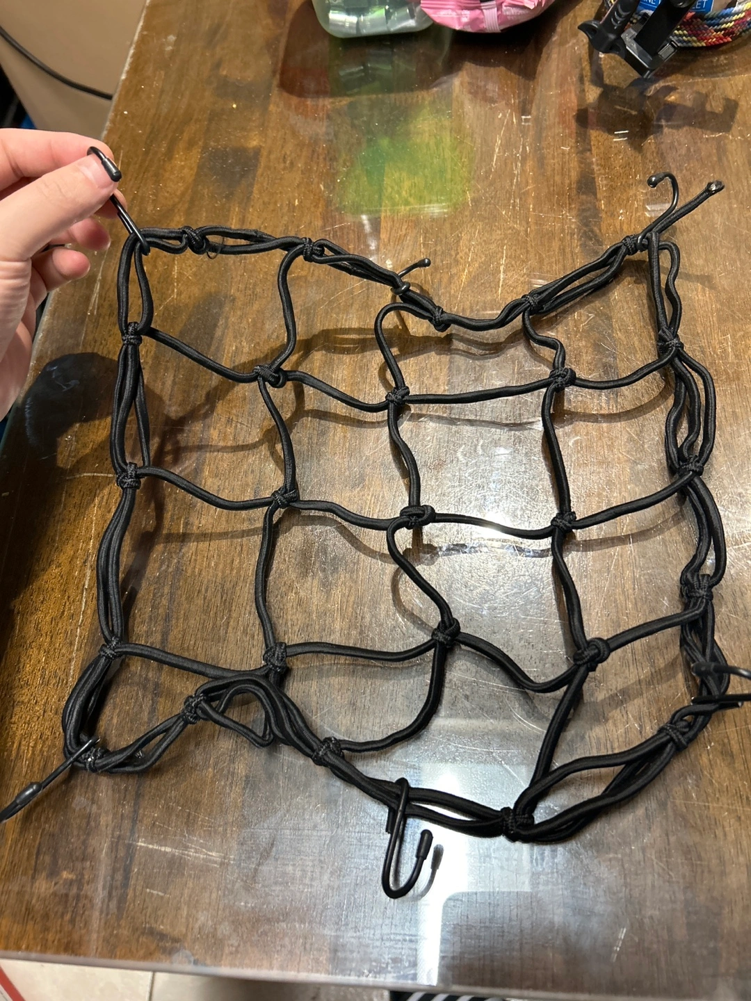 Small black cargo net. Features multiple hooks for securing items. Great for organizing luggage or other cargo.