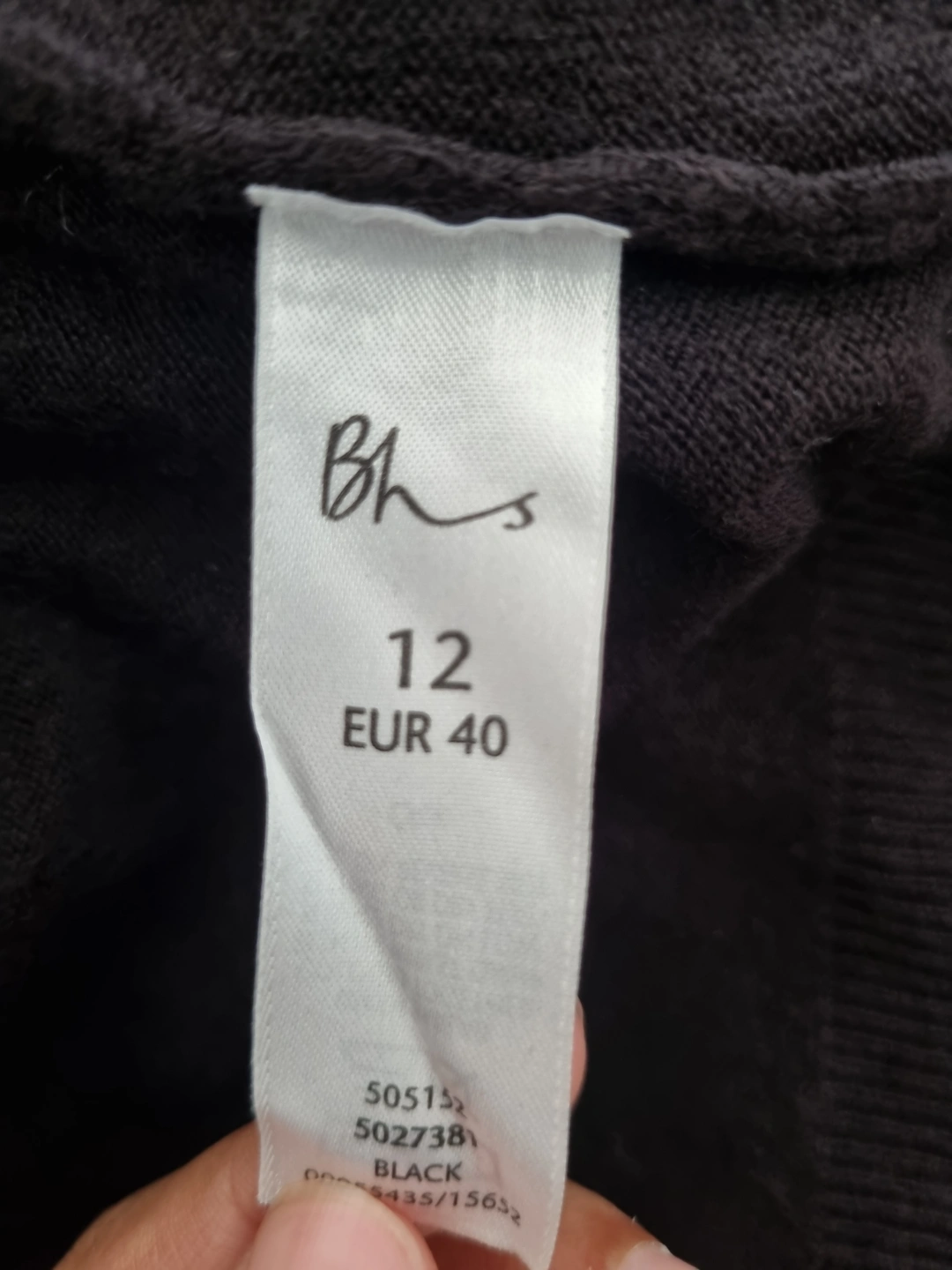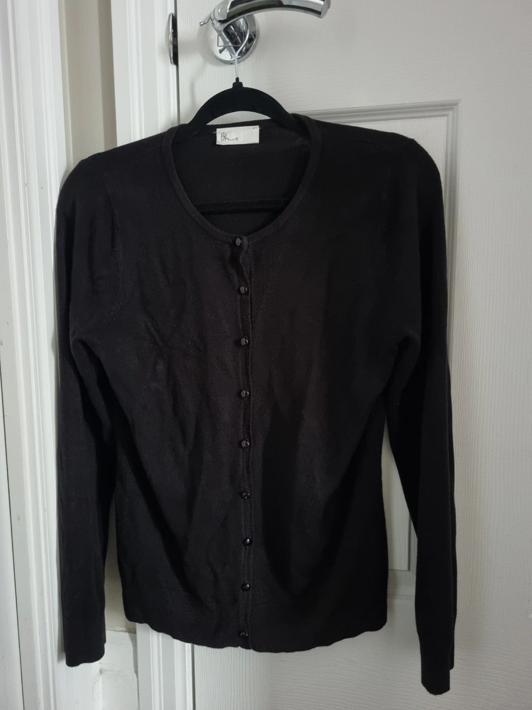 Women's black cardigan. Long sleeves, button closure. Size 12, EUR 40. Soft material. 100% acrylic.