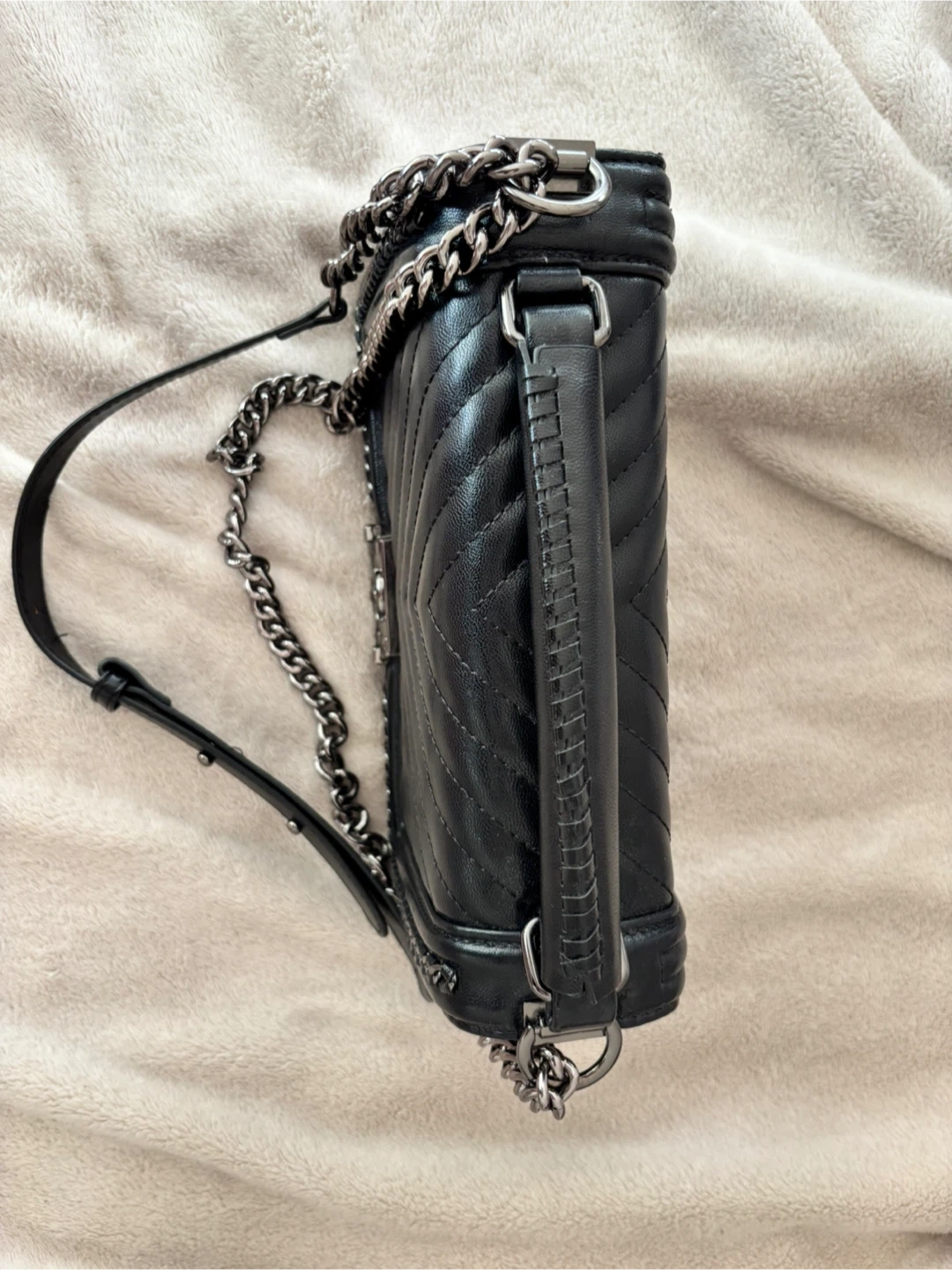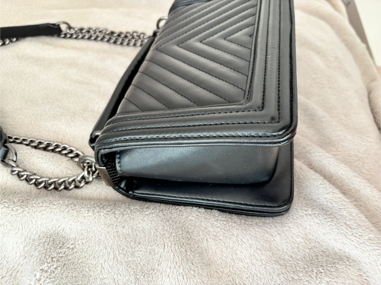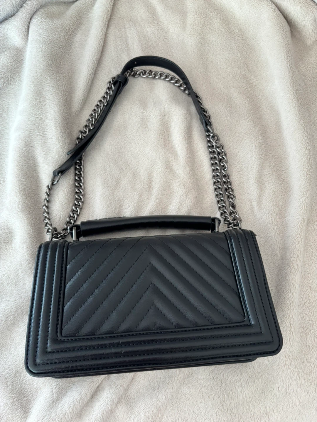 138Selling a black shoulder bag with chain detailing. It has a red interior. There's some wear and tear as shown in the photos, but otherwise in good condition! The chain is expandable for shoulder or crossbody wear.