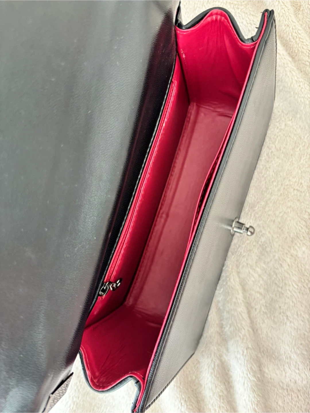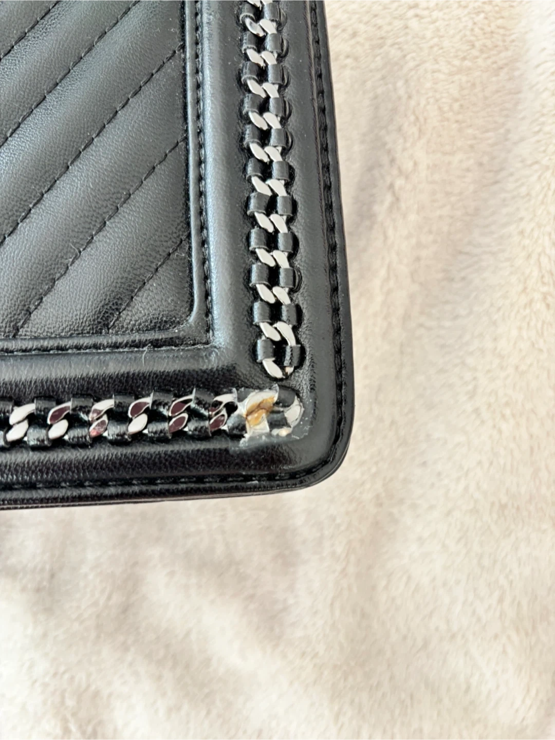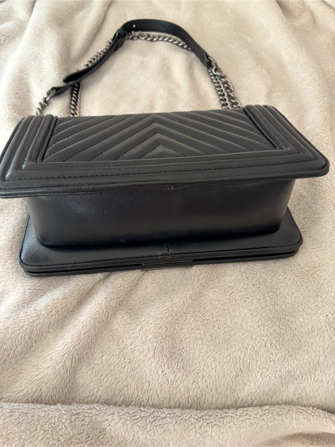 138Selling a black shoulder bag with chain detailing. It has a red interior. There's some wear and tear as shown in the photos, but otherwise in good condition! The chain is expandable for shoulder or crossbody wear.
