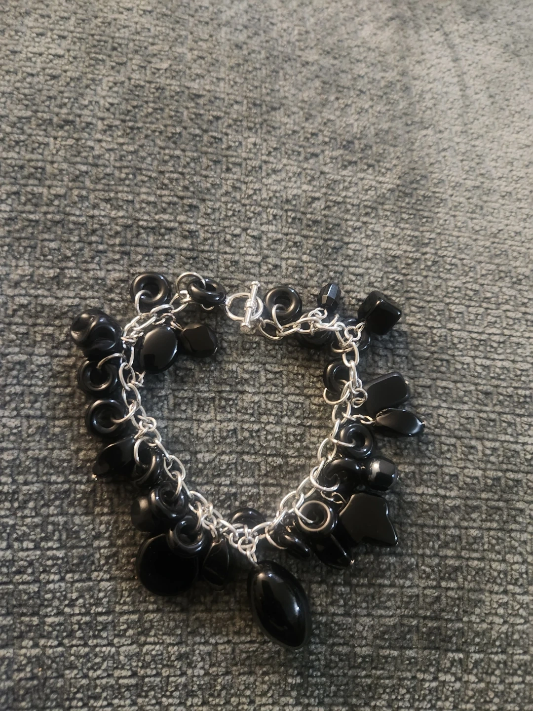 10Selling a beautiful black charm bracelet. It features a silver chain with various black charms attached. It would be a great addition to any jewelry collection!