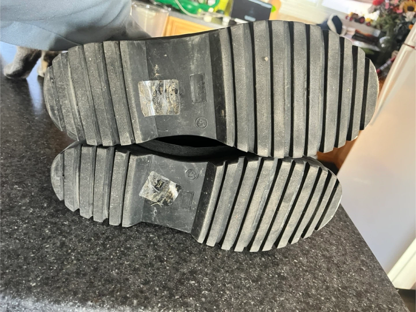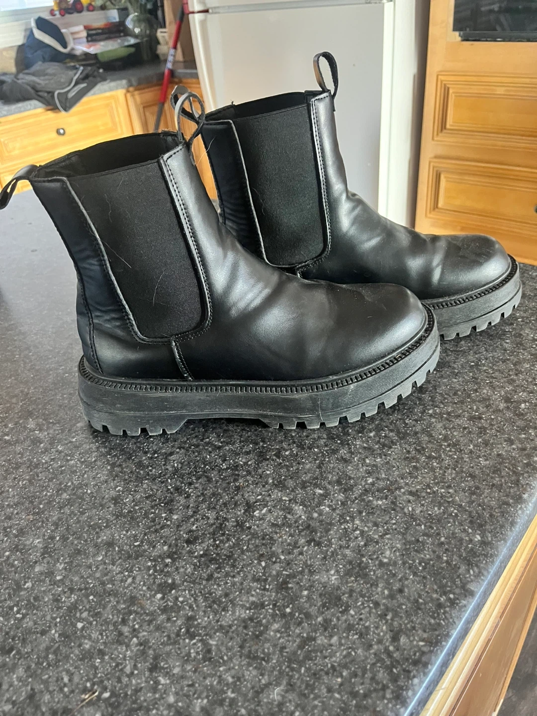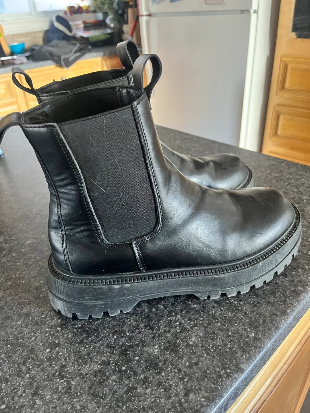 10Selling a pair of black Chelsea boots. They are in used but good condition, as you can see from the photos. The size is 40! Easily can fit a wider foot. Good, thick sole!