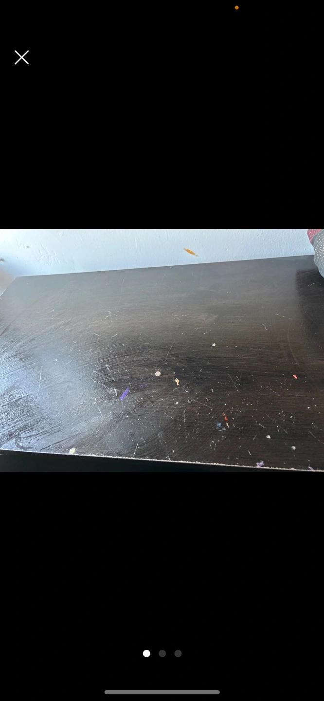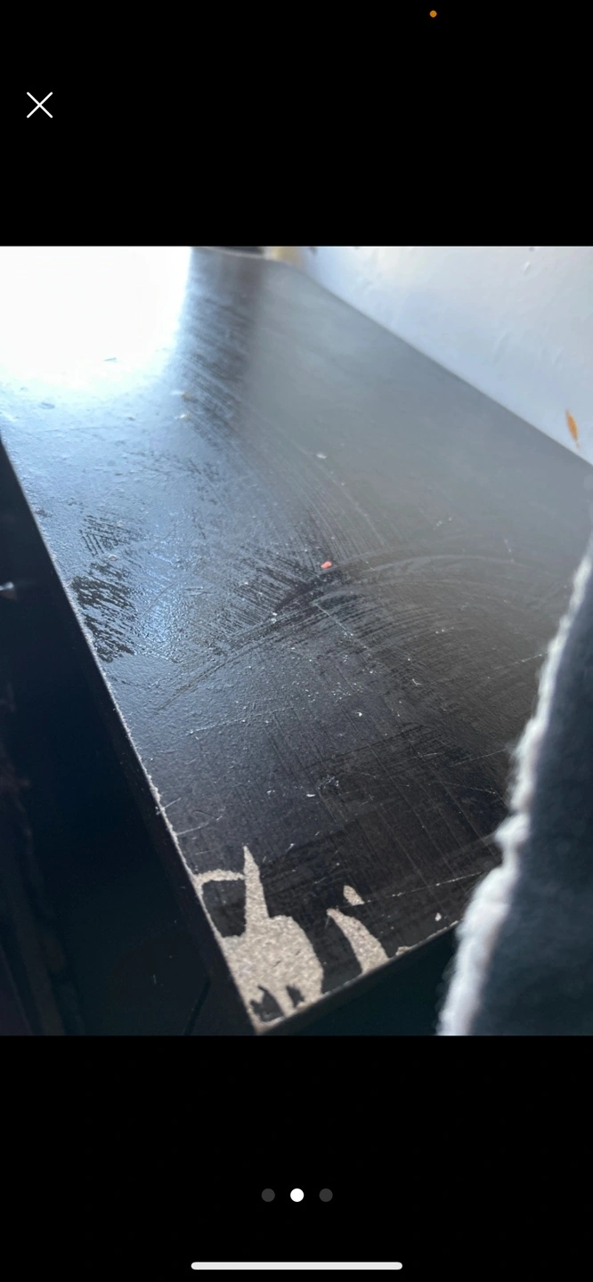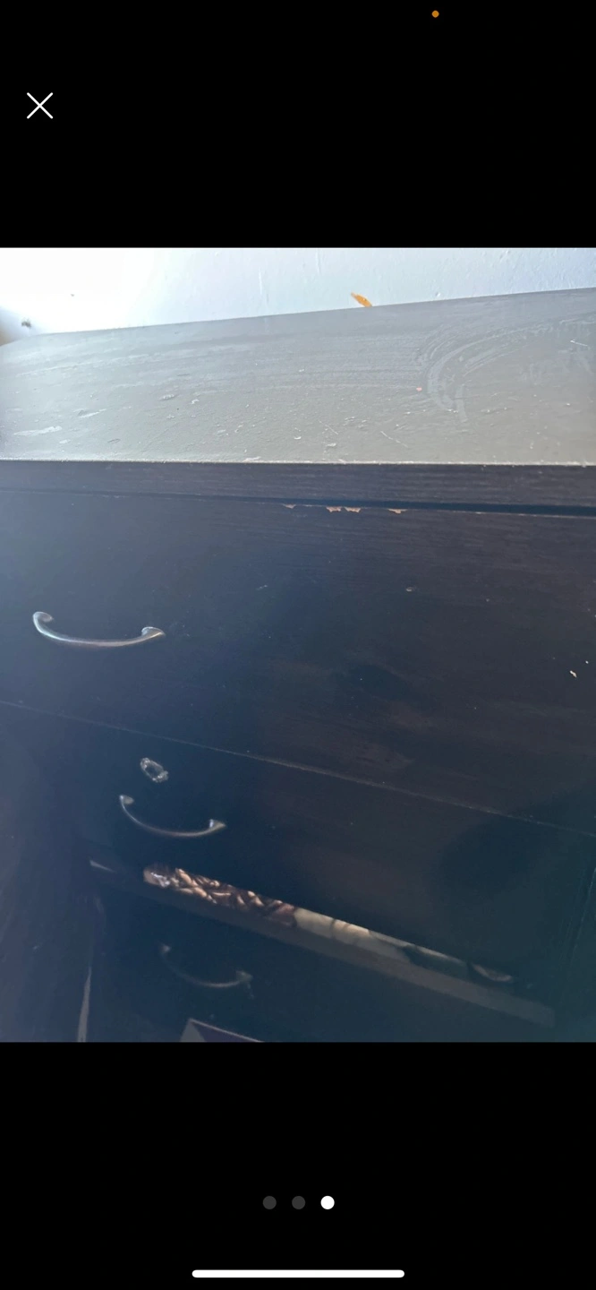 Four-drawer chest of drawers. Black with silver handles. Some wear and tear on the top surface.
