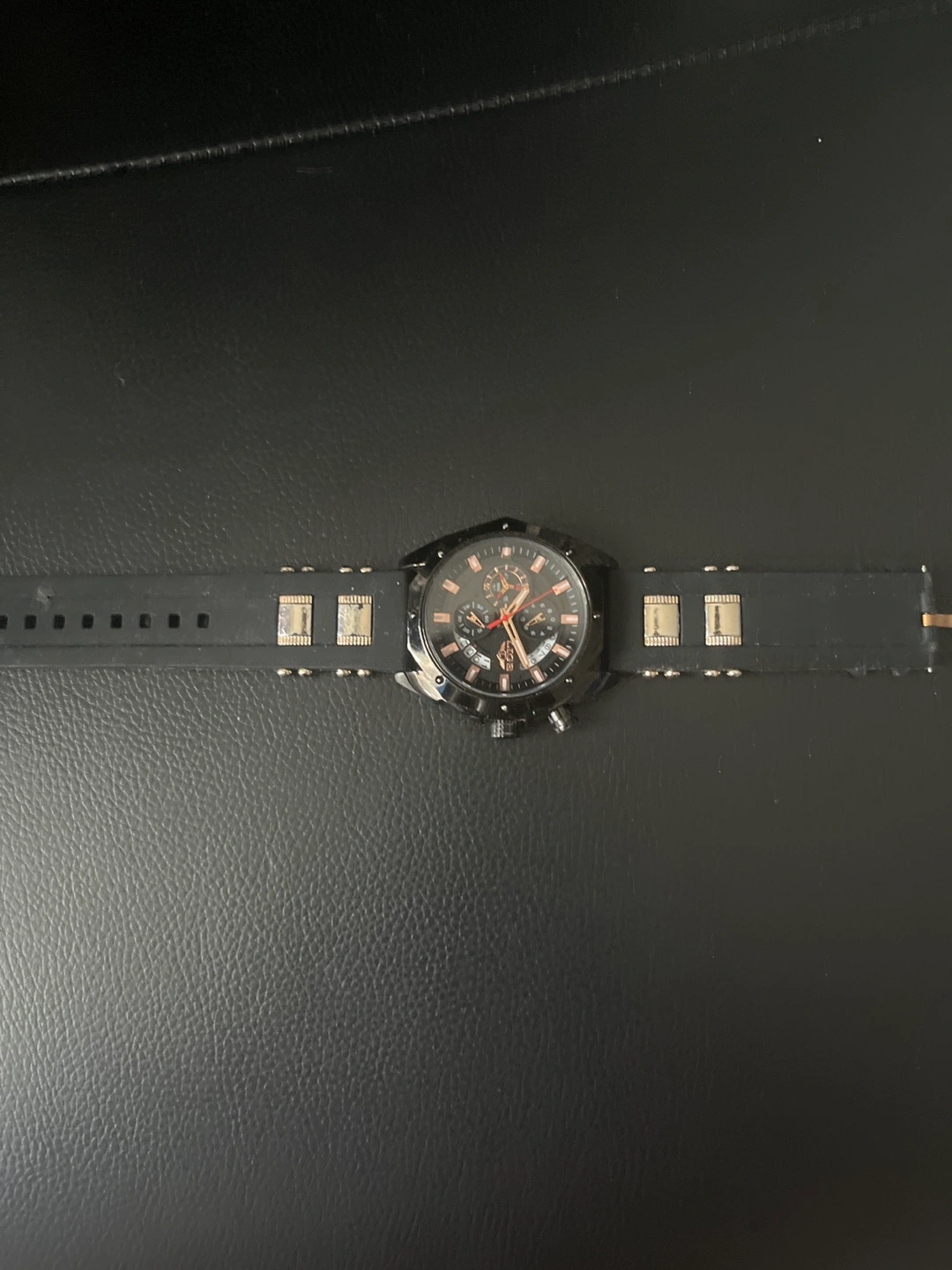 Selling a black chronograph watch. It has a black band and a black face with gold accents. It's in good condition!