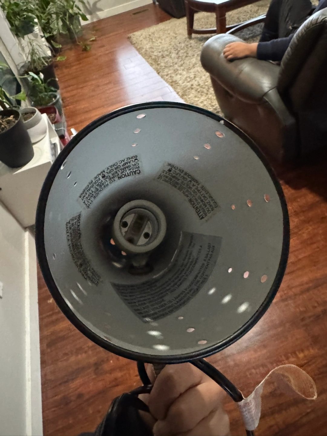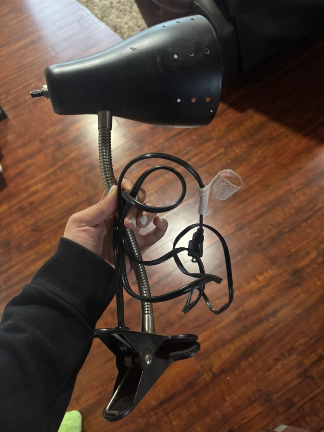 Flexible gooseneck. Black metal clip and shade. Small desk lamp. Good for reading.