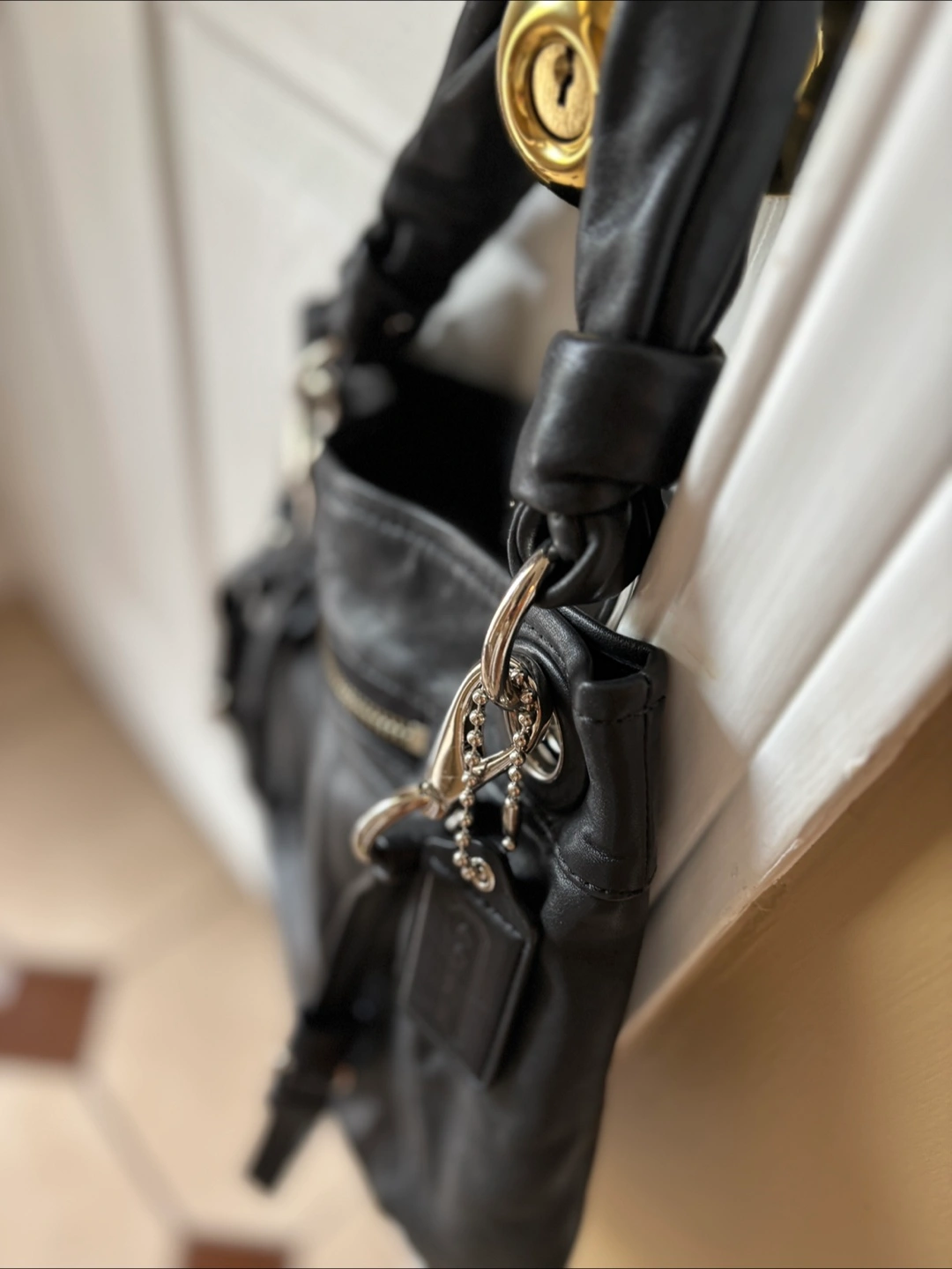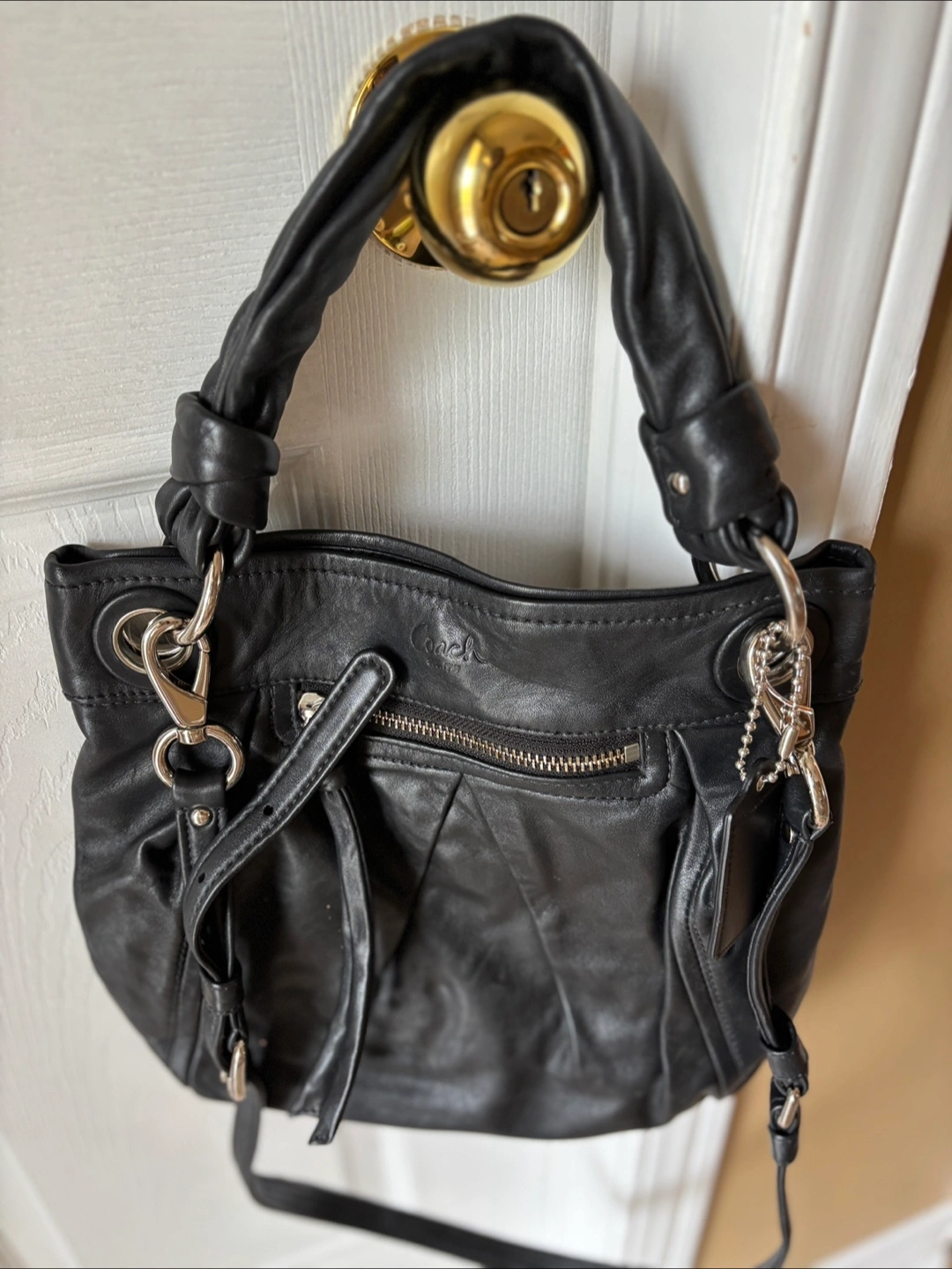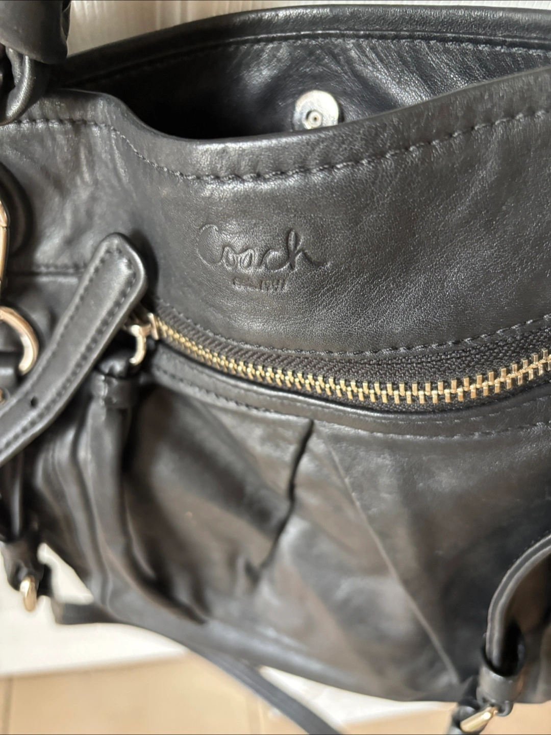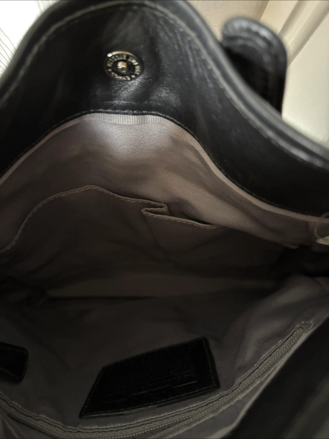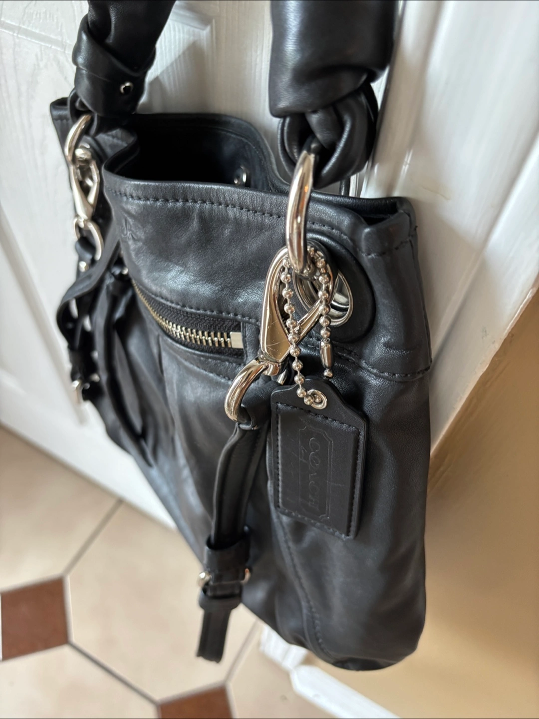Black real soft leather bag with a top handle. Additional strap for shoulder or crossbody wear. Interior pocket. Carry this bag as a comfortable addition to your daily wardrobe.
