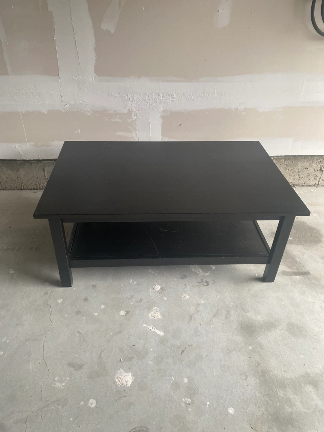 72Here's a simple black coffee table with a shelf underneath for extra storage. It's perfect for a living room or rec room. There are some minor scratches on the top surface.