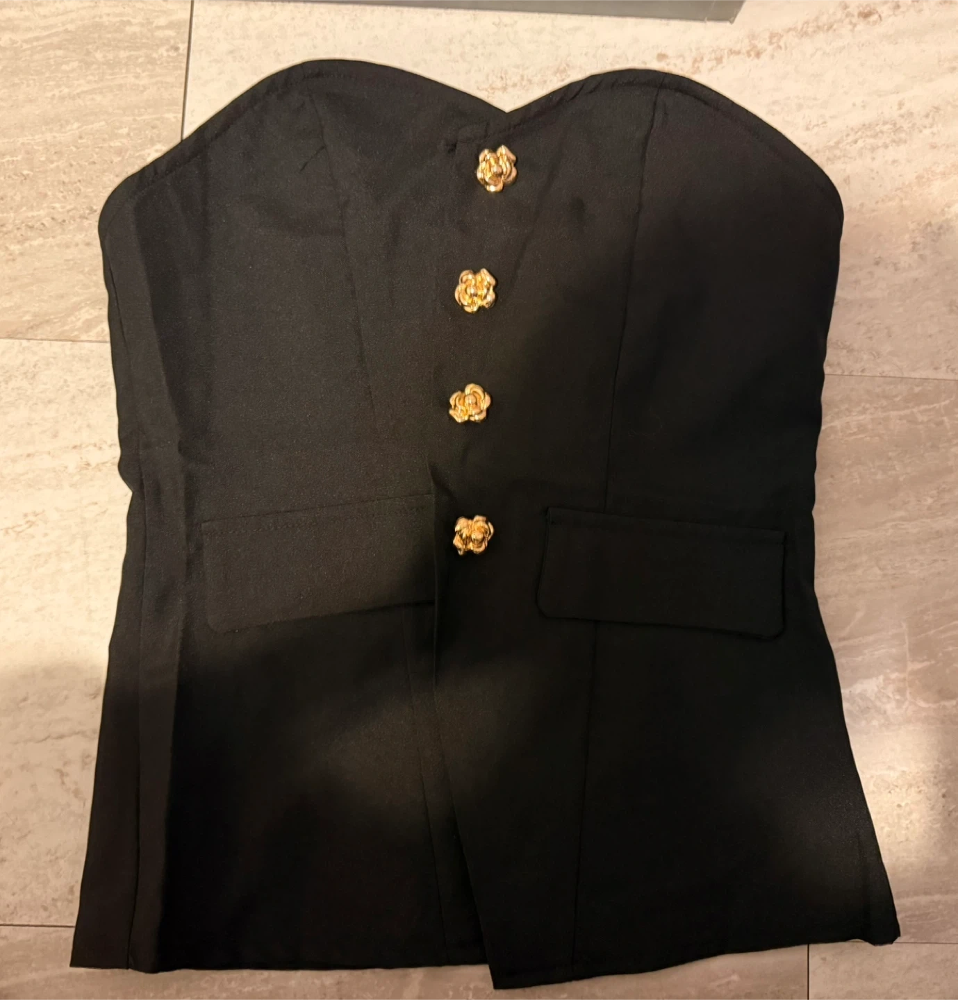 Selling a stylish black corset top! It features a flattering silhouette and unique gold button details. Perfect for adding a touch of elegance to any outfit