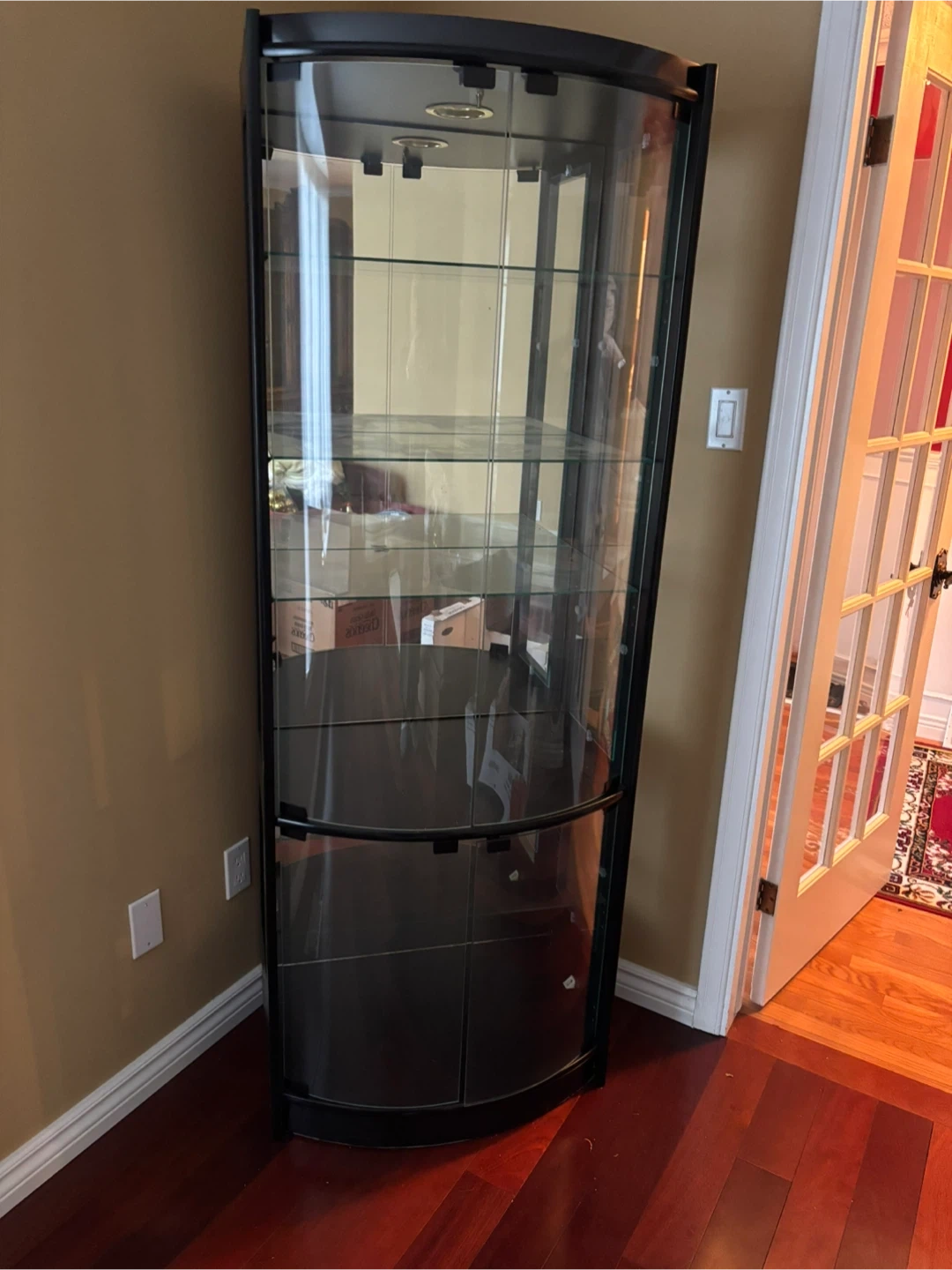 18Selling a curved glass display cabinet with a black frame. It's in good condition and would be perfect for displaying collectibles or other items. The cabinet has multiple glass shelves.