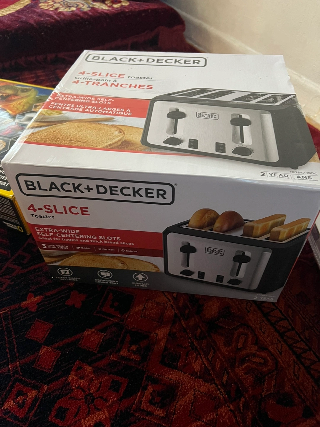 New Black+Decker 4-slice toaster. Extra-wide self-centering slots, great for bagels and thick bread slices. Features one-touch controls, bagel setting, frozen setting, cancel button, toast shade settings, dropdown crumb tray, and high-lift lever.