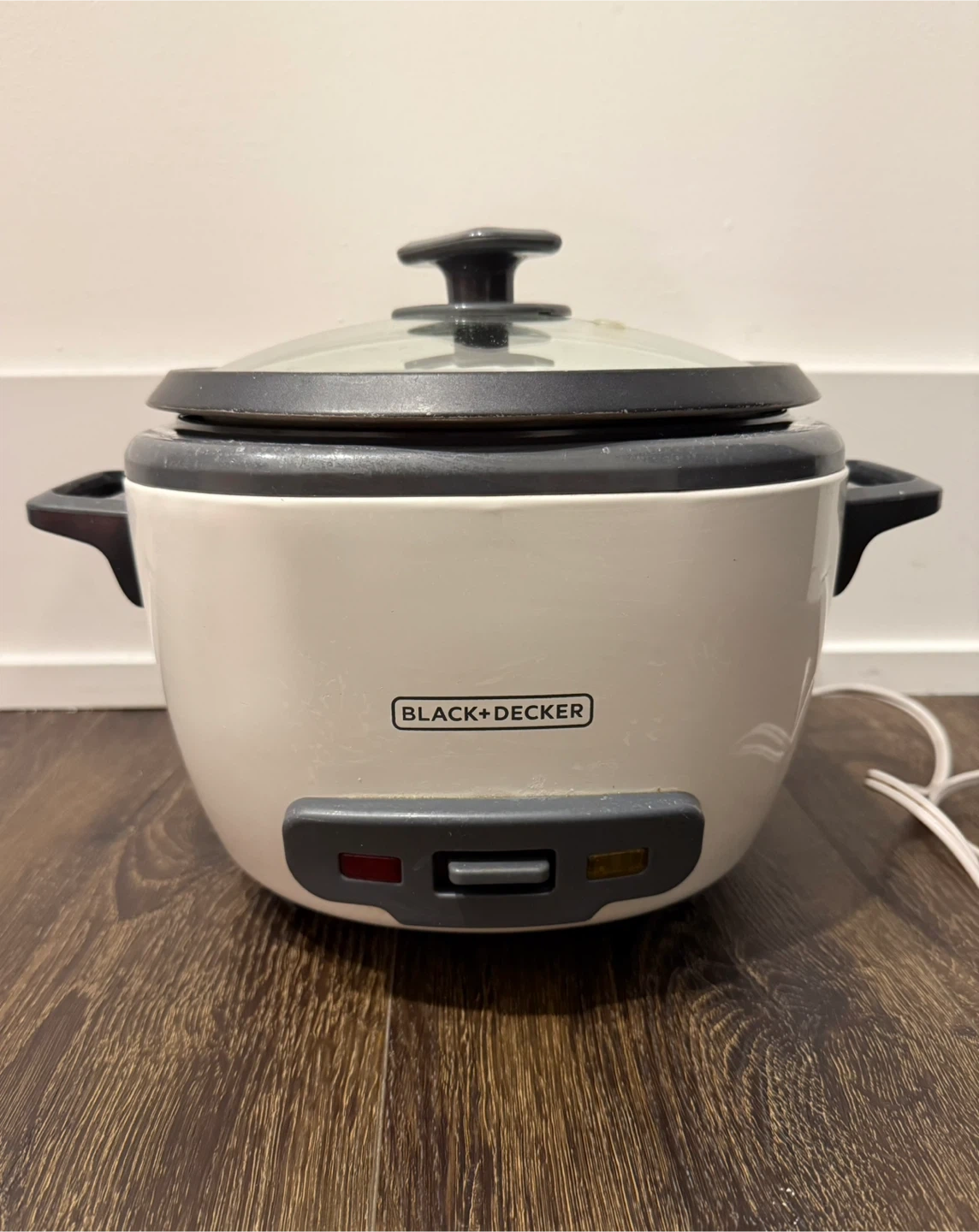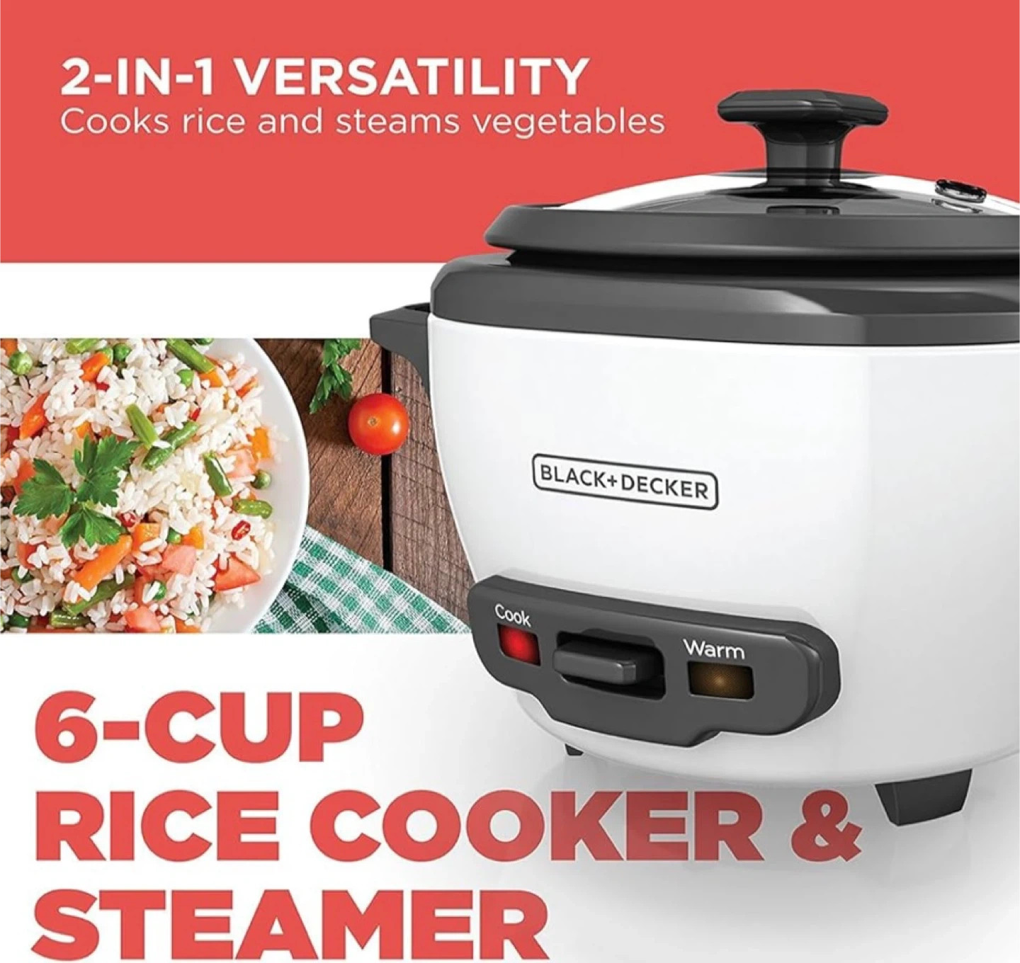 183I'm selling a Black+Decker 6-cup rice cooker and steamer! It's a handy 2-in-1 appliance that cooks rice and steams veggies with ease. It's in great condition and ready to help you make delicious meals. Plus, the parts are dishwasher safe for easy cleanup