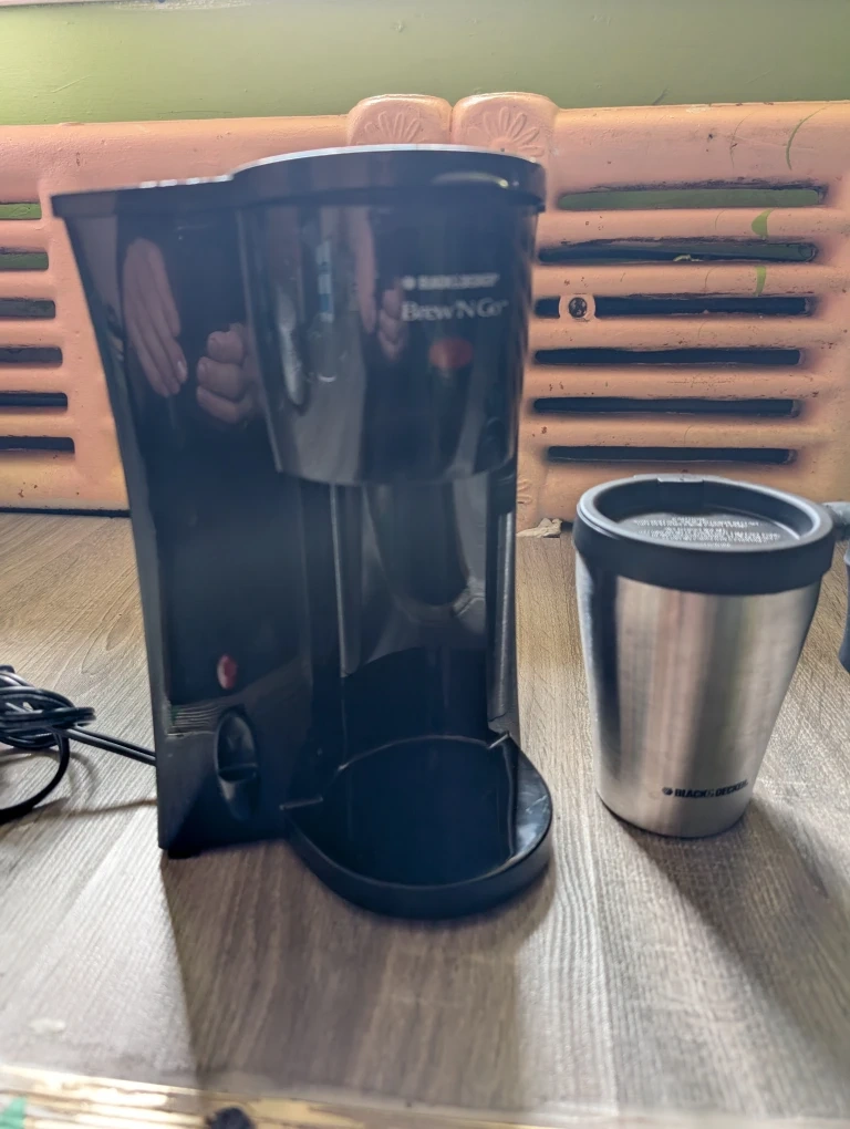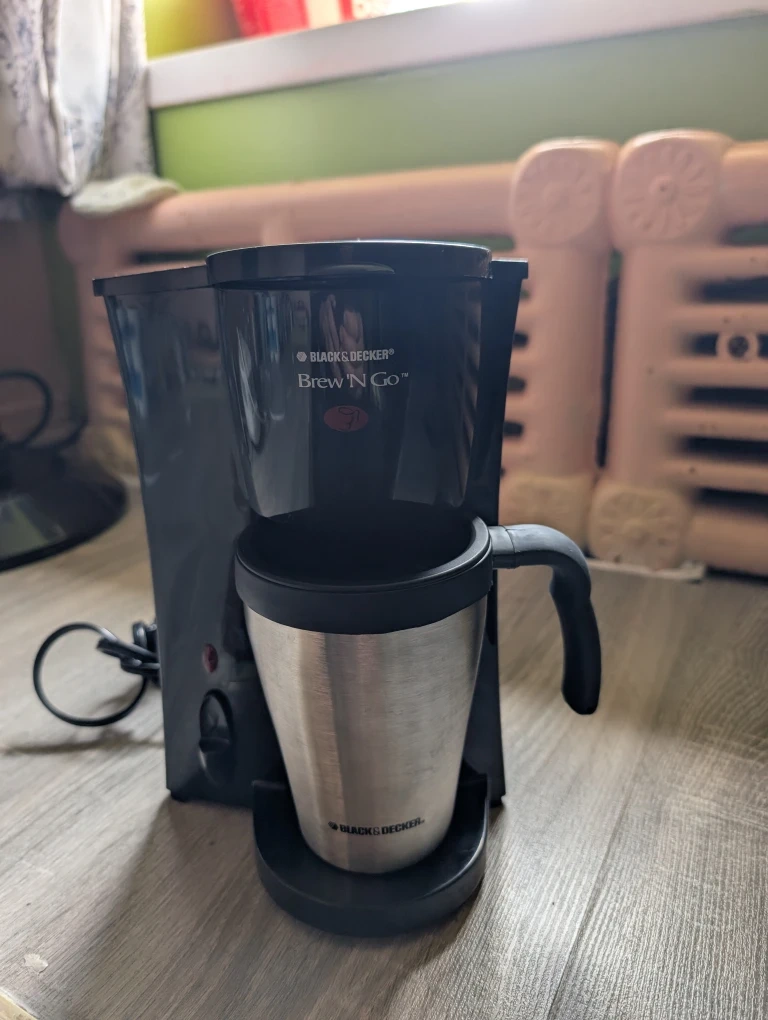 65Get your caffeine fix on the go with this Black+Decker Brew N' Go personal coffee maker! It's in great shape and comes with the travel mug, so you can brew directly into it and head out the door. Perfect for a quick and easy morning routine