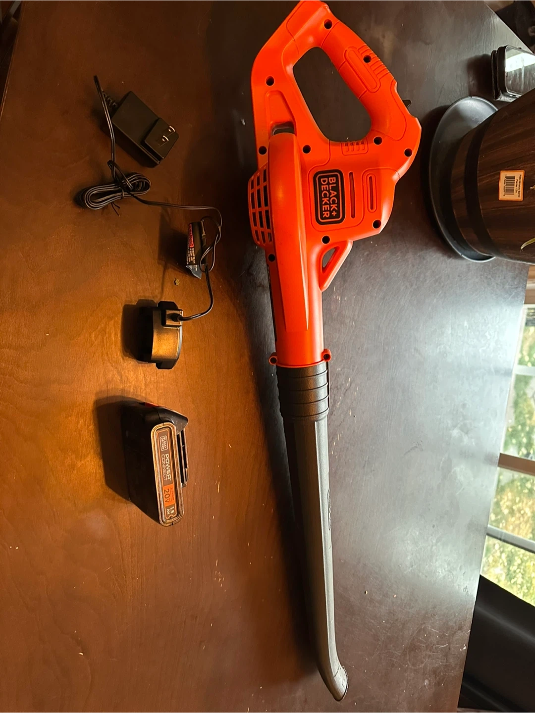 Selling a Black+Decker cordless sweeper/leaf blower in orange and black. It comes with the battery and charger. Perfect for quick cleanups around the yard