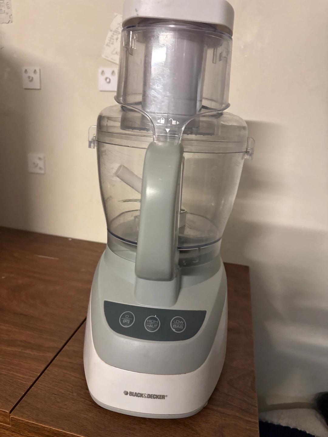 Used Black+Decker food processor. Multiple speed settings. Includes a work bowl and blade. Great for chopping, slicing, and mixing.