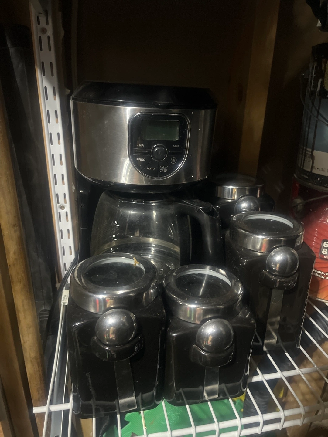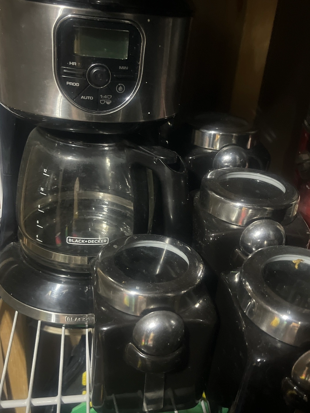 76Programmable coffee maker, glass carafe. Four matching black canisters, silver lids. Good condition.