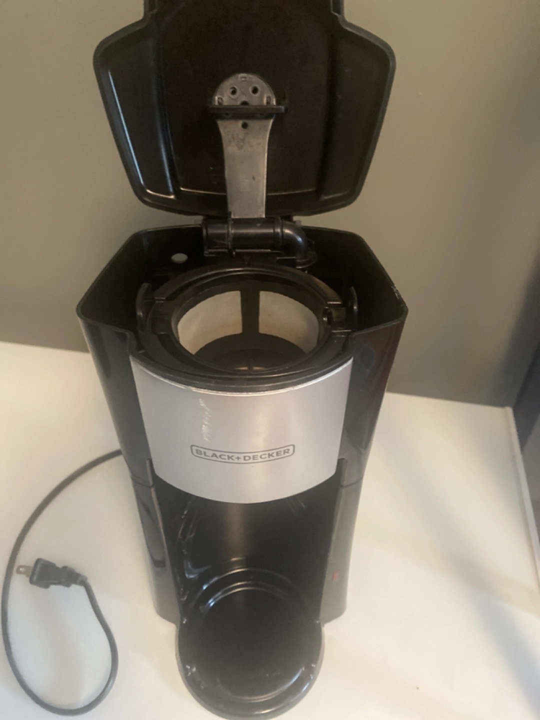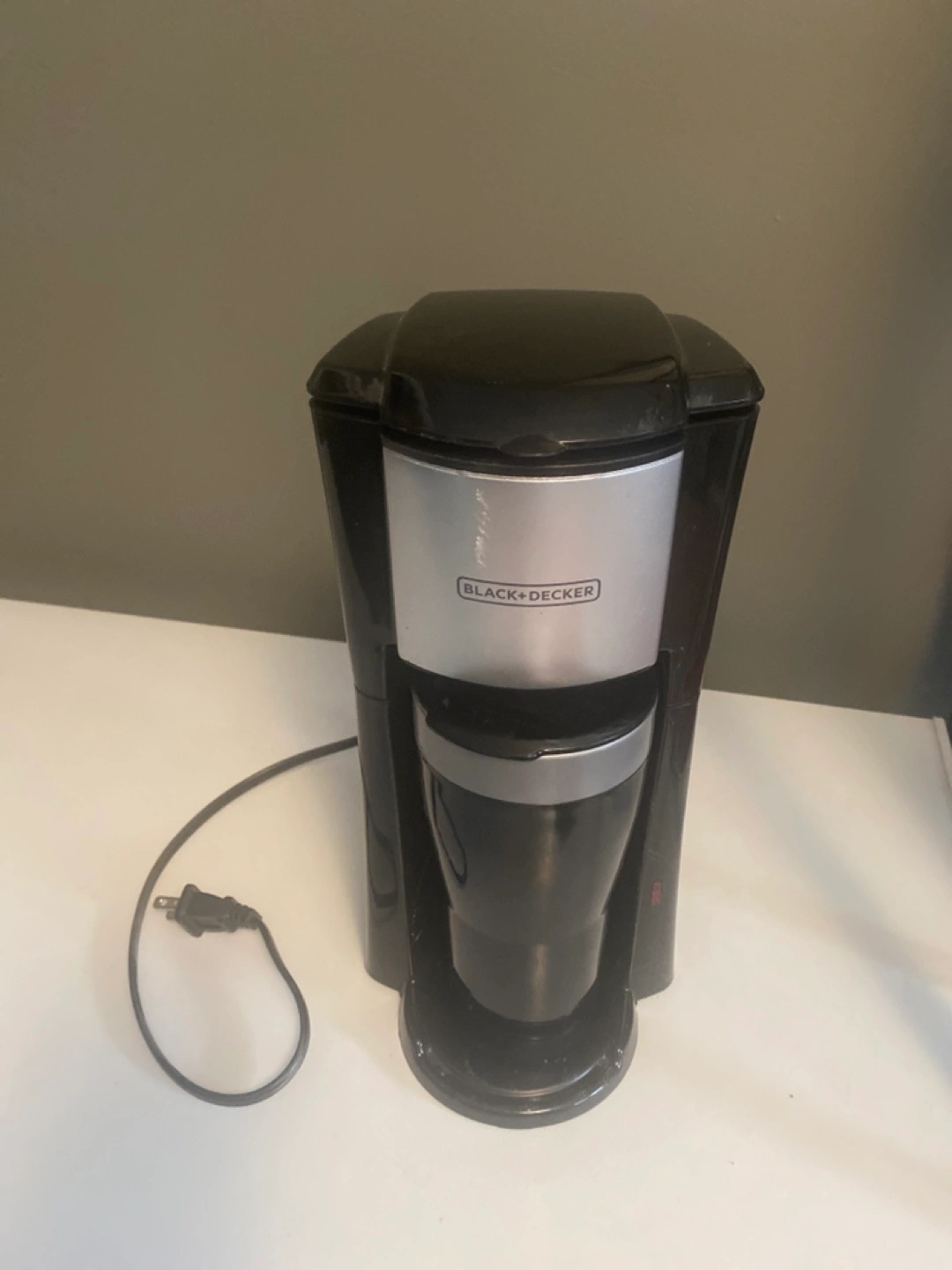 Black and silver single-serve coffee maker. Includes removable filter basket and cord. Makes one cup at a time.