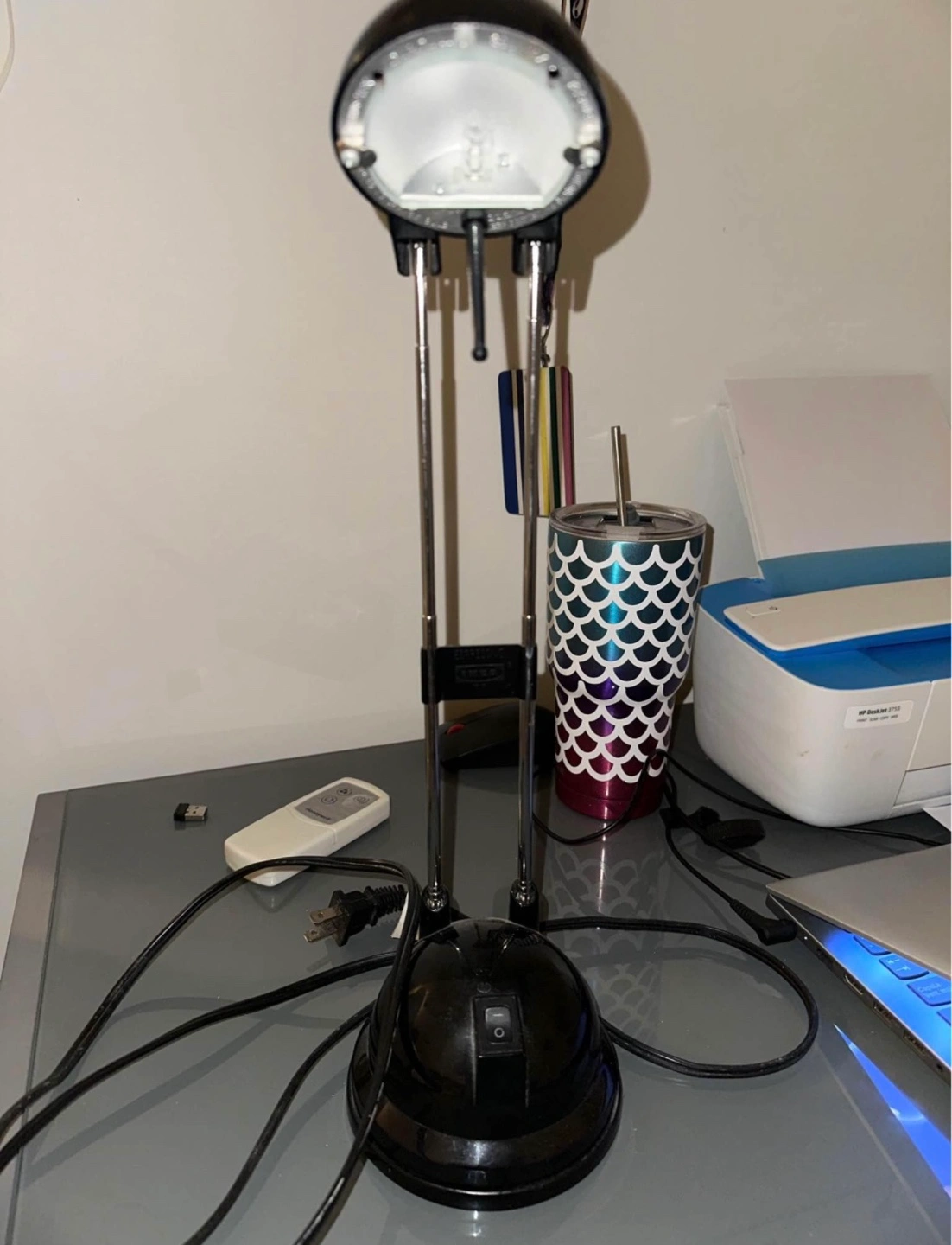 Black desk lamp with a flexible arm. The lamp has a switch on the base.