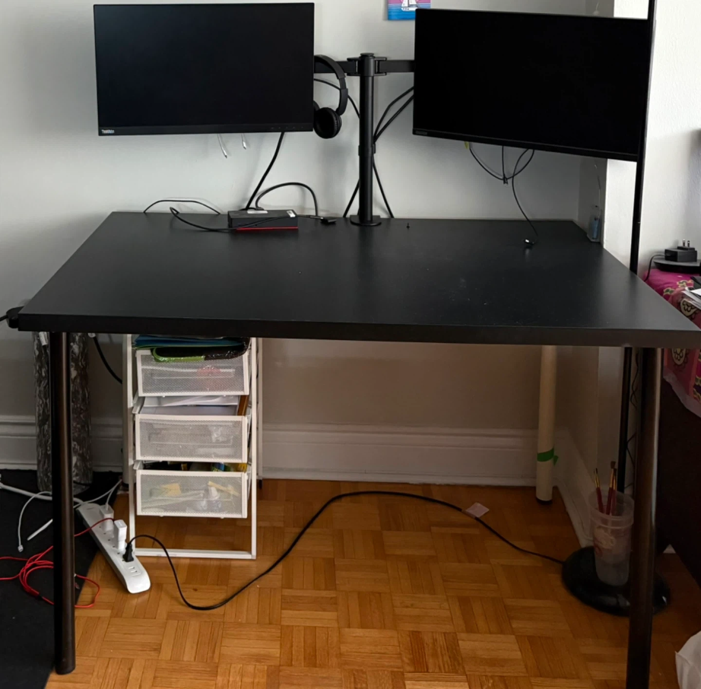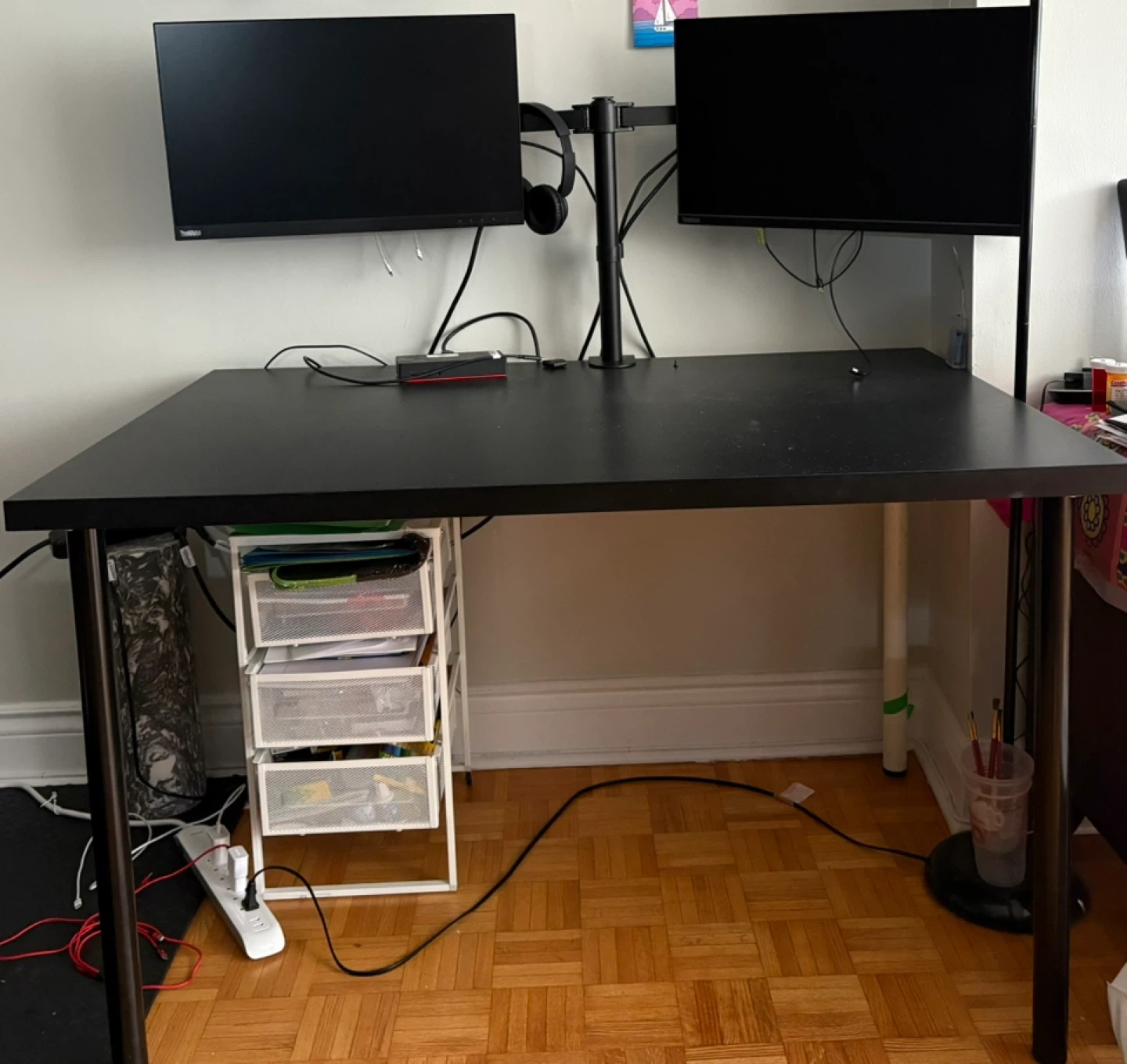 32Selling a black ikea desk in great condition. It's perfect for a home office, gaming or study space. Its bigger than all the usual desks. The desk has a sleek and modern look that will fit well with any decor. Dimensions in cm (Ikea product). Comes with two black legs and two white.
