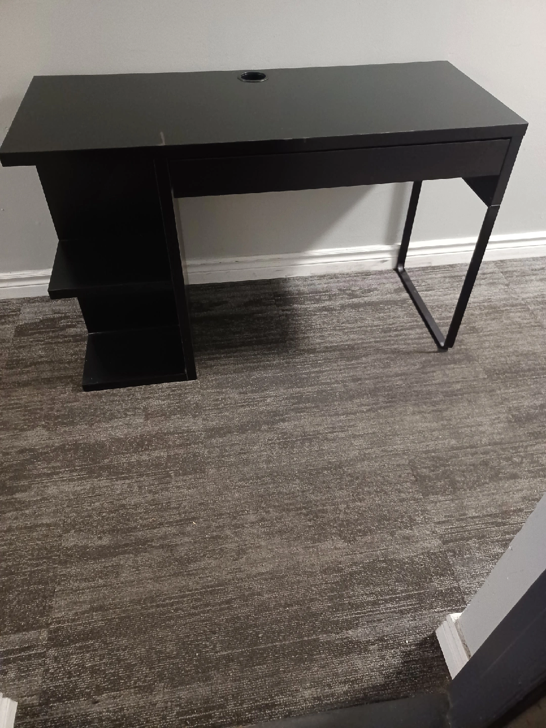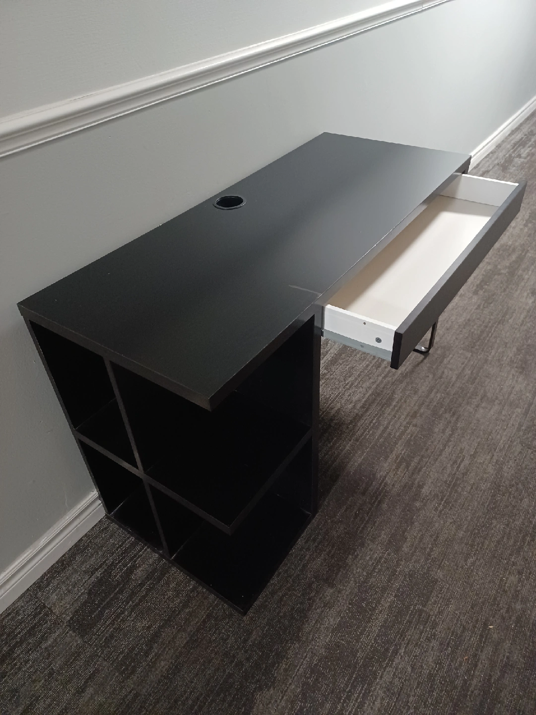219Selling a sleek black desk that's perfect for a home office or study space! It features a handy drawer and some shelves for extra storage. It's in great condition and ready for a new home! Dimensions: length is 47 inches, Width is 19.75 inches and Height is 29.5 inches. a stroke of scratch is on the left side of the top.
