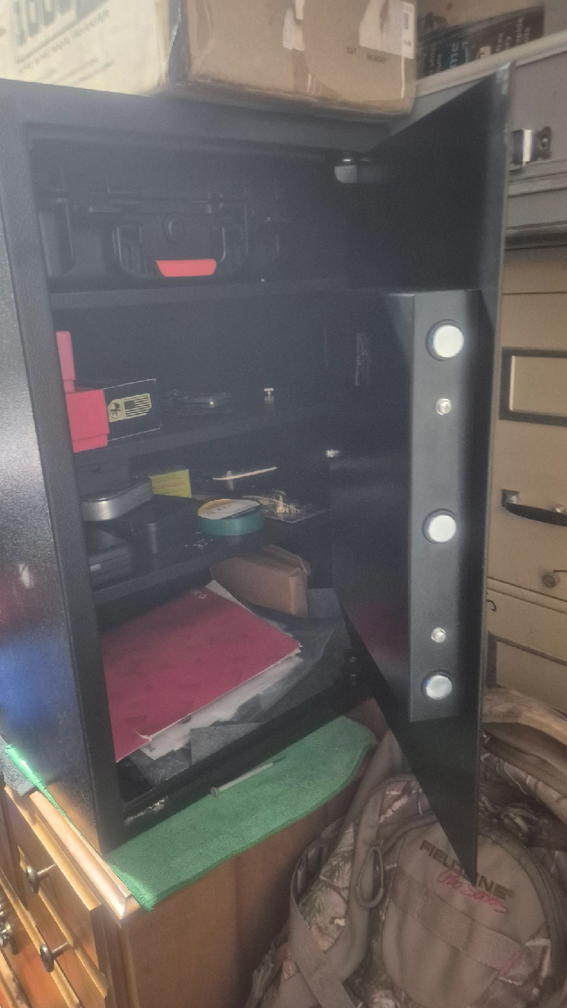 Selling a black digital safe. It has an electronic lock and interior shelving. Great for storing valuables or important documents. In good condition and ready for a new home 23" 3/4" H x 15" W x 12 1/4 D.